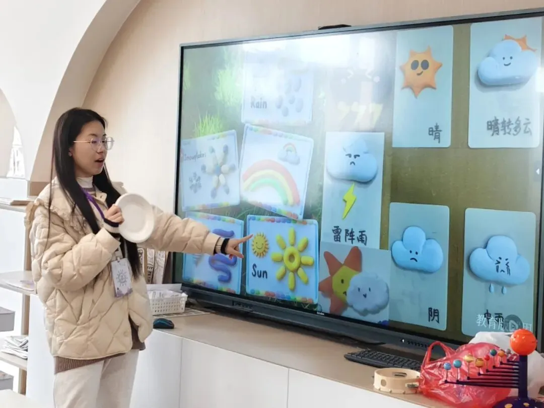 有的小朋友捏了一个圆圆的太阳,说是“我喜欢在晴朗的天气出去玩”;有的小朋友捏了一朵灰色的云,说“今天虽然阴天,但我还是很开心”;还有的小朋友捏了彩虹,骄傲地说:“彩虹的多种颜色很神奇!”孩子们的小手在泡泡泥间穿梭,专注又认真。不一会儿,一个个生动稚嫩的“气象符号”就诞生了!