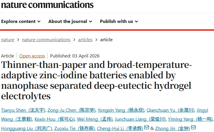 Tianyu Shen#, Zongju Chen#, Yongxin Yang, Qianchuan Yu, Jingyi Wang, Kexin Hou, Wei Meng, Junchuan Liang, Yiming Yang, Hongguang Liu, Zuoxiu Tie, Chenghui Li*, Zhong Jin*. Thinner-than-paper and broad-temperature-adaptive zinc-iodine batteries enabled by nanophase separated deep-eutectic hydrogel electrolytes. Nature Communications, 2026
