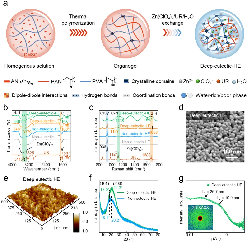 研究团队首先展示了深共晶水凝胶电解质的精妙制备策略(图1a)。通过二甲基亚砜介导聚乙烯醇和丙烯腈的溶解,加热引发丙烯腈原位聚合,最后通过溶剂交换实现DMSO与深共晶电解液的置换。在这一过程中,聚乙烯醇的亲水相与聚丙烯腈的疏水相自发组织成双连续纳米相分离结构,相区尺寸仅为10-30纳米,远低于可见光波长。红外光谱分析(图1b)揭示了深共晶体系中关键分子相互作用:氨基甲酸乙酯(UR)的N-H不对称伸缩振动发生54-66 cm-1的蓝移并伴随峰展宽,同时C=O伸缩振动红移6 cm-1,证实了UR与Zn2+的配位以及三维氢键网络的形成。拉曼光谱(图1c)进一步验证了这一相互作用,UR的C-N和N-H伸缩频率分别偏移+17和+10 cm-1。扫描电镜图像(图1d)清晰展示了10-30 nm的纳米相分离形貌,而原子力显微镜(图1e)则进一步确认了约20 nm的相区尺寸。X射线衍射图谱(图1f)显示深共晶水凝胶中PVA的(101)和(200)衍射峰显著增强,表明结晶度提高,为优异力学性能提供了结构基础。小角X射线散射(图1g)定量解析出25.7 nm和10.9 nm两个特征距离,分别对应疏水相区和结晶相区的间距,与电镜观察结果高度吻合。