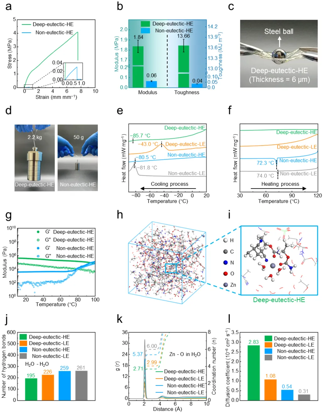 Figure 2.力学性能与温度耐受性。 a–b,(a)深共晶水凝胶电解质和非共晶水凝胶电解质的拉伸-应变曲线,(b)弹性模量和韧性。c–d,厚度为6微米的深共晶水凝胶电解质提起重物的照片。e–f,各种电解质在(e)低温和(f)高温范围内的差示扫描量热曲线。g,深共晶水凝胶电解质和非共晶水凝胶电解质的G'和G''的温度依赖性。h–i,(h)深共晶水凝胶电解质的分子动力学模拟快照和(i)相应的Zn2+溶剂化结构。j–l,通过分子动力学模拟计算的各种电解质中的(j)水分子间氢键数量、(k)径向分布函数和配位数以及(l)Zn2+扩散系数。