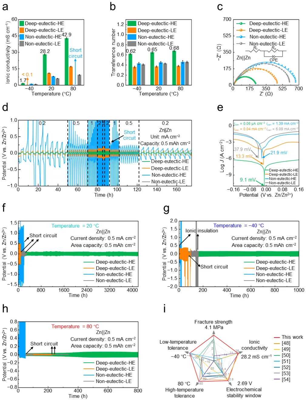 Figure 3.电化学性能。 a–c,深共晶水凝胶电解质、深共晶液态电解质、非共晶水凝胶电解质和非共晶液态电解质在不同温度下的(a)离子电导率、(b)Zn2+迁移数和(c)界面阻抗。d–h,(d)倍率性能、(e)Tafel曲线以及Zn||Zn对称电池在(f)20 °C、(g)−40 °C和(h)80 °C下的恒流循环稳定性。i,深共晶水凝胶电解质与近期报道的其他水凝胶电解质在断裂强度、离子电导率、电化学稳定窗口和低/高温耐受性方面的性能比较。