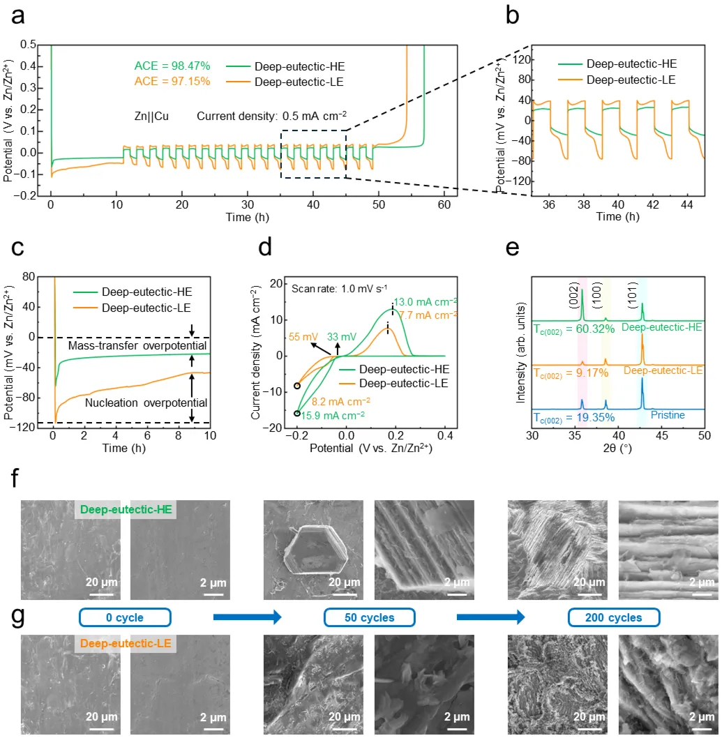 Figure 4. 锌沉积/剥离行为。 a–b,分别用深共晶水凝胶电解质和深共晶液态电解质组装的Zn||Cu半电池的(a)电位-时间曲线及(b)其放大视图。c–d,分别用深共晶水凝胶电解质和深共晶液态电解质组装的Zn||Cu半电池的(c)初始锌沉积过程中的电压曲线和(d)循环伏安曲线。e–g,从经过锌沉积/剥离过程后的Zn||Zn对称电池中取出的锌电极的(e)X射线衍射图谱以及(f–g)扫描电镜图像:(f)深共晶水凝胶电解质,(g)非共晶液态电解质。