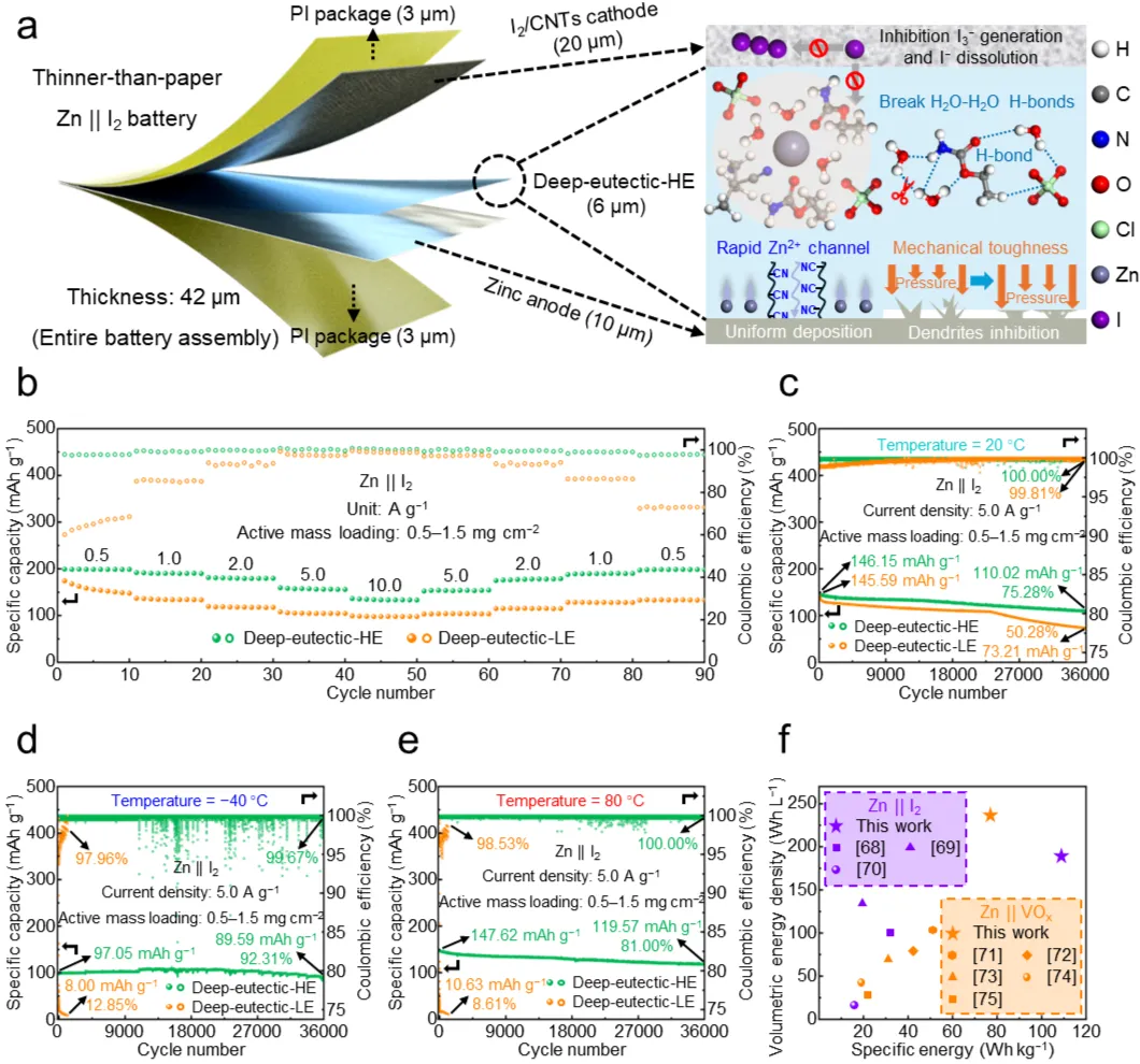 针对上述挑战,近日,来自南京大学金钟教授、李承辉教授团队报道了一种通过纳米相分离、水合共晶溶剂化和氢键网络三者协同作用构建的深共晶水凝胶电解质(deep-eutectic-HE)。该电解质实现了4.1 MPa的断裂强度和13.66 MJ m-3的卓越韧性,在20 °C下展现出高达28.2 mS cm-1的Zn2+电导率和0.65的Zn2+迁移数。同时,丰富的氢键网络有效固定了活性水分子,确保电池在−40 °C至80 °C的宽温域内稳定工作。基于该电解质组装的Zn||I2全电池总厚度仅为42微米(比标准A4纸更薄),具备高柔性,在−40 °C至80 °C范围内实现了超过36,000次的超长循环寿命,并在180°弯折等严苛机械形变下依然保持稳定供电。这项研究通过分子设计、相调控与工艺工程的融合,为开发兼具高能量密度与极端环境耐受性的先进柔性电池建立了可行的方法论框架。相关论文以“Thinner-than-paper and broad-temperature-adaptive zinc-iodine batteries enabled by nanophase separated deep-eutectic hydrogel electrolytes”为题,发表在国际顶级期刊Nature Communications上。沈天宇、陈宗举为本文第一作者。