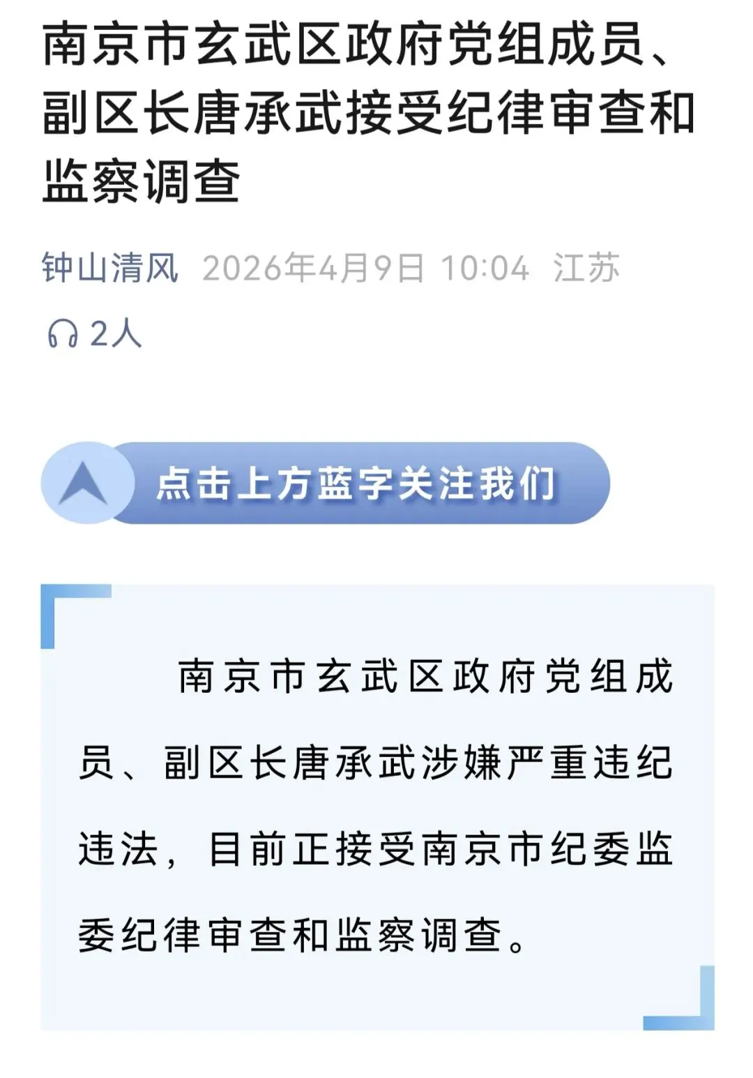 >江苏南京 唐承武被查!现任玄武区人民政府党组成员、副区长