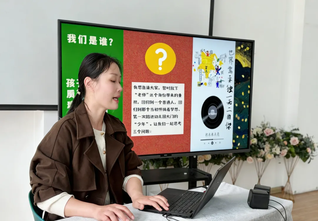 培训伊始,曹老师向全体教师抛出了三个灵魂拷问:“我们是谁?孩子是谁?教育的本质是什么?” 在世俗的眼光里,幼儿教师或许只是“带孩子唱歌跳舞的阿姨”。但在华耀之星,我们给自己的定义是:追逐光的向阳花,是照亮孩子童年的那束温暖阳光。 曹老师引用了雅斯贝尔斯的名言:“教育意味着一棵树摇动另一棵树,一朵云推动另一朵云,一个灵魂唤醒另一个灵魂。”在AI可以写教案、甚至辅助教学的今天,唯有教师给予孩子带有体温的拥抱、捕捉眼中失落并给予鼓励的能力,是机器永远无法替代的。