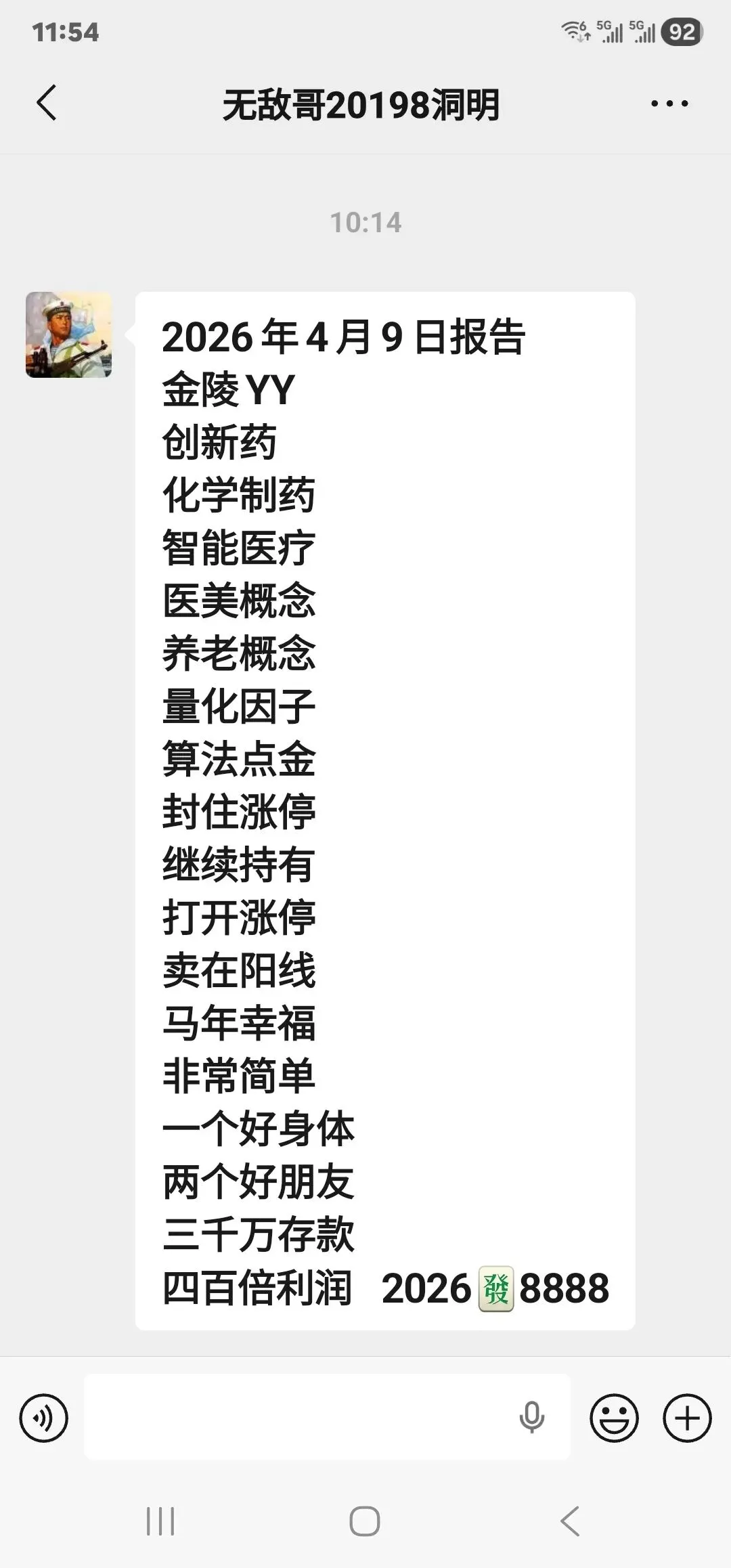 津药药业:昨天上午,再封涨停,出现密码,打开涨停,无敌哥20198群发报告:卖在阳线,马上有钱。原文:金陵药业 马上有钱