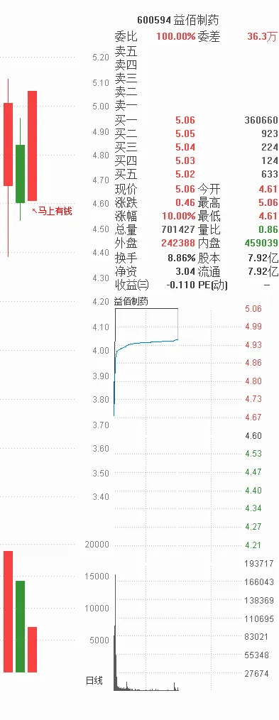 益佰制药:提前公示,无论你搞,或者不搞,它就在那,昨天收跌8.18%,今天上午,直线雄起,封住涨停,马上有钱。有图有真相。