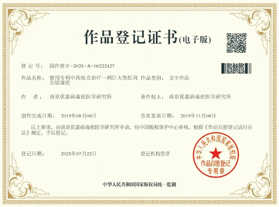 【中国版权保护中心】使用专利中药处方治疗一例巨大型肛周尖锐湿疣