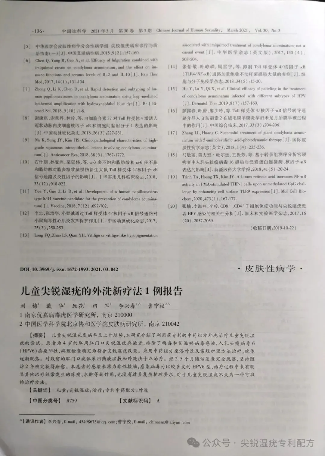 该专利组方应用于临床治疗20多年,不仅帮助了数以万计的复发患者解决困扰,还被医学书籍《尖锐湿疣的诊治》收录在册,并两次在核心医学期刊《中国性病科》上发表多篇学术论文。在2019年11月第28卷第11期《中国性科学》杂志中发表了一篇名为《使用专利中药处方治疗一例巨大型肛周尖锐湿疣》的学术性论文;在2021年3月第30卷第3期《中国性科学》杂志中发表了一篇名为《儿童尖锐湿疣的外洗新疗法1例报告》的学术性论文。详情如下图所示:(内容来自中国知网)