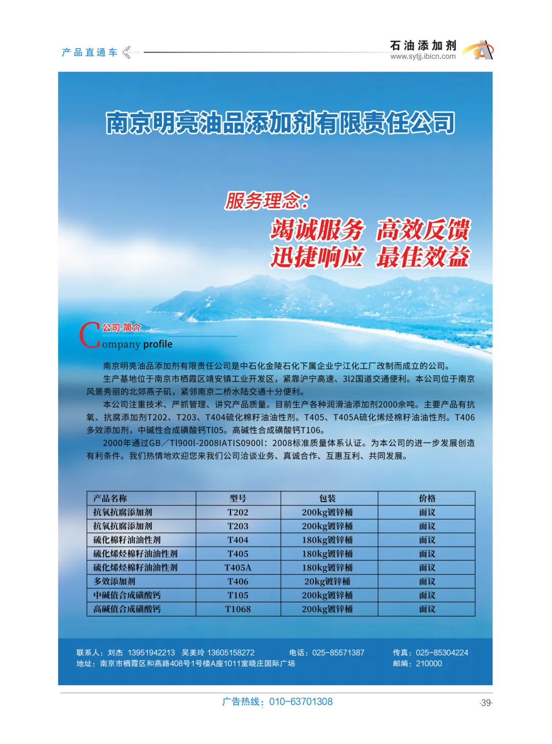 生产基地位于南京市栖霞区靖安镇工业开发区,紧靠沪宁高速、312国道,交通便利。公司位于南京风景秀丽的北郊燕子矶,紧邻南京二桥水陆交通十分便利。公司注重技术、严抓管理、讲究产品质量。目前生产各种润滑油添加剂2000余吨。主要产品有抗氧、抗腐添加剂T202、T203、T404硫化棉籽油油性剂。T405、T405A硫化烯烃棉籽油油性剂。T406多效添加剂。公司以“质量第一、信誉第一、客户第一”为宗旨。2012年通过GB/T19001-2008 idt ISO9001:2008 标准。为公司的近一步发展创造了有利条件。公司欢迎客商前来洽谈业务、真诚合作、互惠互利、共同发展。