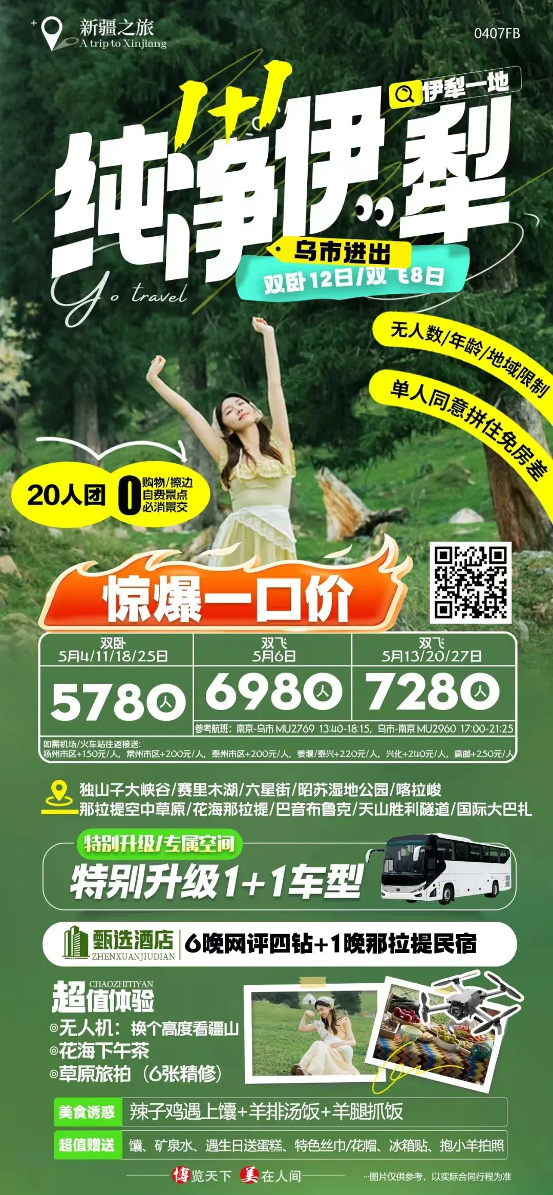 南京出发 新疆旅游 纯玩 伊犁 1+1豪华保姆大巴 南京直飞乌鲁木齐往返8日/双卧12日,20人内团 5780元/人起