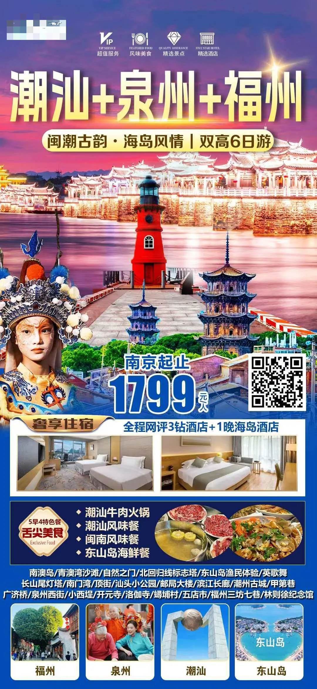 南京出发 广东旅游 潮汕+福州+泉州双高6日游 1799元/人起 4月12日 最后6位置 先到先得