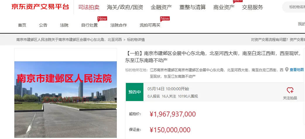 拿地近18年、规划要建超400米摩天大楼的南京奥体苏宁广场,最终还是难逃易主命运。最近,京东资产交易平台上架了一则拍卖公告,标的物“南京市建邺区会展中心东北角,北至河西大街,南至白龙江西街,西至现状,东至江东南路不动产”,直指奥体苏宁广场。根据拍品详情,奥体苏宁广场现状为基坑回填状态,用地性质为城镇混合住宅用地,独用土地面积32993.11平方米,将于5月14日正式拍卖,起拍总价约19.68亿。拿地至今,这座占据元通商圈得天独厚位置的综合体备受南京人关注,命运却一波三折。如今正式上架拍卖,吸引超万人关注,令人唏嘘。01