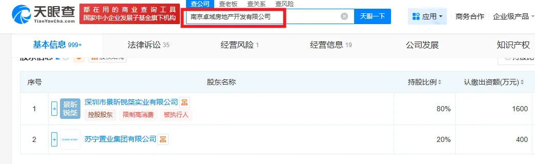 到了2018年4月,项目开发主体生变,苏宁置业与南京卓域房地产开发有限公司签订了《国有土地使用权转让合同》。天眼查显示,该公司的股东为持股80%的深圳市景昕锐桀实业有限公司、持股20%的苏宁置业集团有限公司,深圳市景昕锐桀实业有限公司,则由中信信托100%持股。