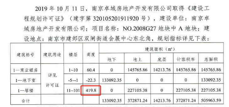 2019年1月,奥体苏宁广场最新规划设计方案出炉,报审总面积约50.6万平方米,容积率11.3;绿地率≥20%;建筑密度≤40%;地上总建筑高度419.8米,地上99层地下5层;功能主要包括商业、办公、酒店、酒店式公寓和配套地下停车场等。
