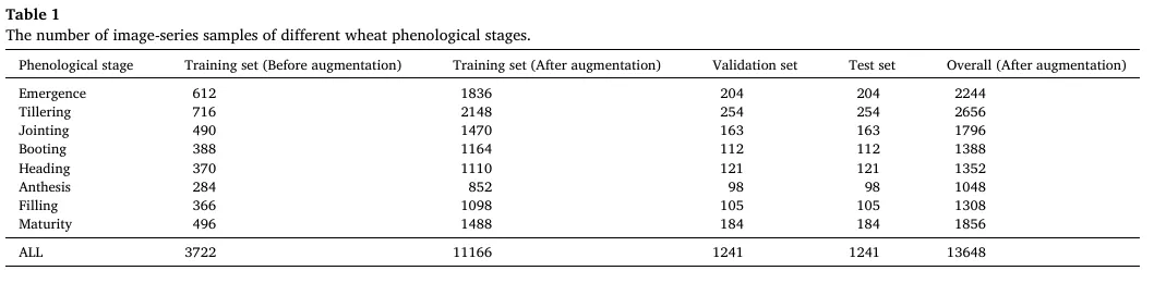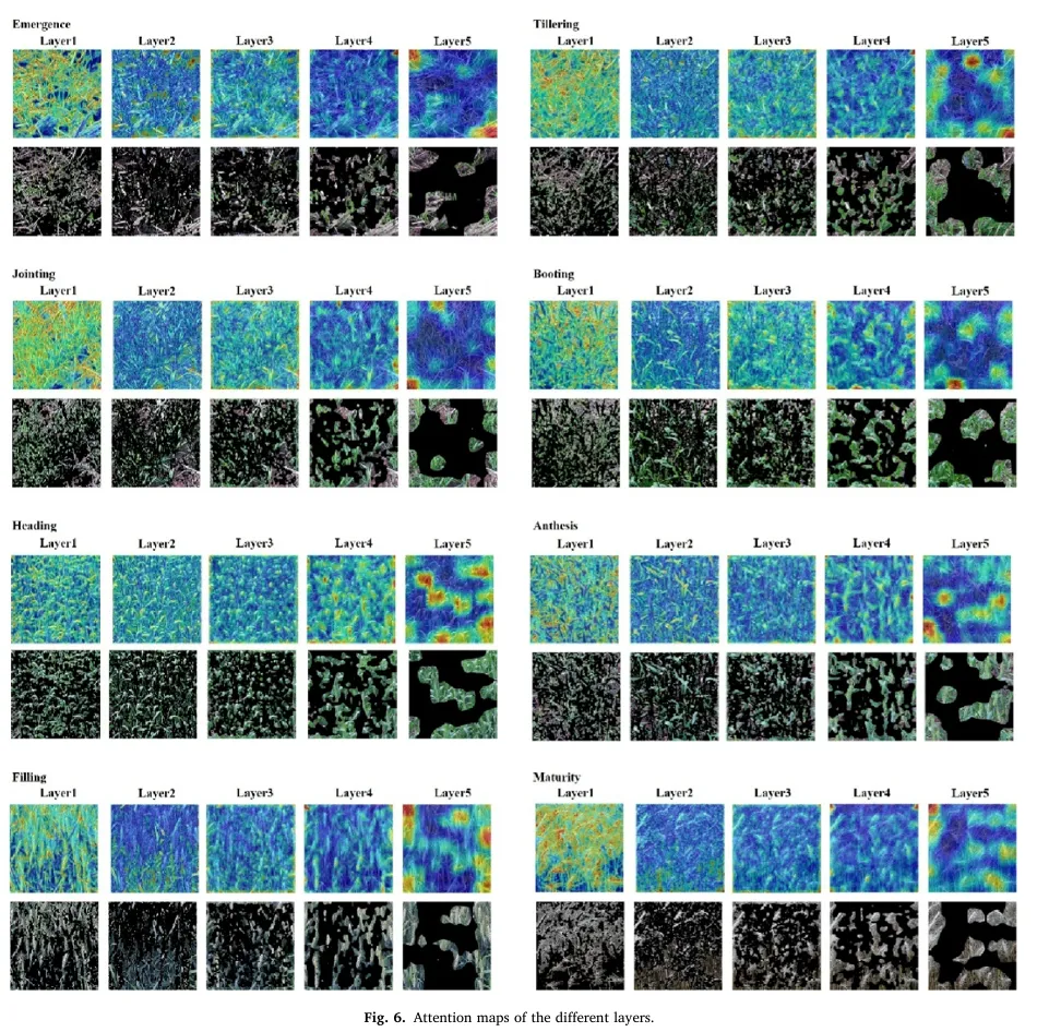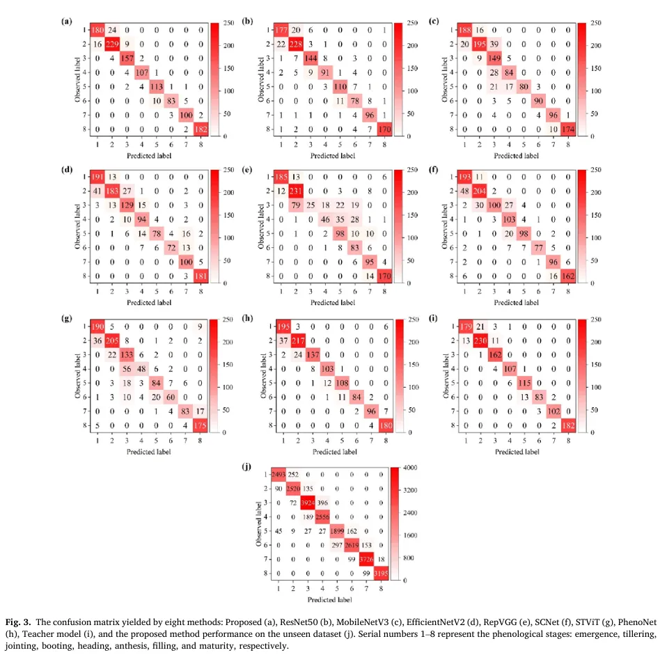 从混淆矩阵(Fig. 3)可以看出,所有模型在拔节期(3)、孕穗期(4)、抽穗期(5)、开花期(6)四个连续阶段均存在一定程度的误判。这一现象可归因于:该时段小麦形态变化呈渐进性(茎秆逐渐伸长、叶片角度缓慢变化、麦穗尚未完全抽出),缺乏明显的视觉突变特征。