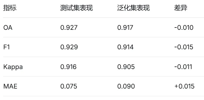 结果表明,模型在完全未见过的数据集上仍保持了91.7%的总体精度,各指标下降幅度均在可接受范围内,说明WPDSI具备良好的跨年份、跨品种、跨栽培管理的泛化能力。