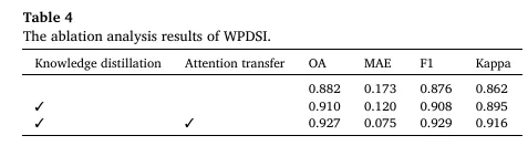 相比之下,WPDSI的混淆矩阵对角线分布最为显著,尤其在上述四个易混淆阶段的误判率明显低于其他对比模型。这表明知识蒸馏与注意力迁移的联合优化策略有效增强了模型对细微形态差异的捕捉能力。