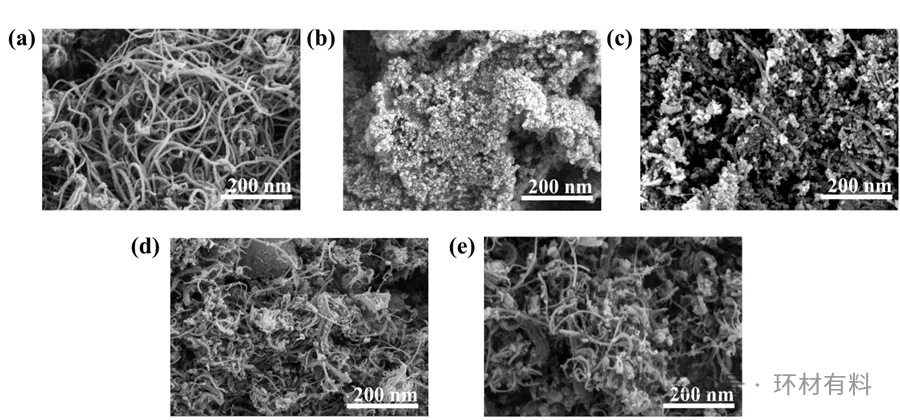 利用扫描电镜对材料的表面形貌和结构进行了观察:从图b中可以看到CNTs材料之间的相互交织更加紧密,这与CNTs的高表面能和CNTs之间的范德华力有关。从图b中可以观察到共沉淀法制备的Fe3O4的团聚现象。图(c-e)显示了负载Fe3O4纳米材料的功能化CNTs的SEM形貌,可以看出,团聚现象得到了缓解,Fe3O4呈球形颗粒状态,分布在功能化CNTs表面。