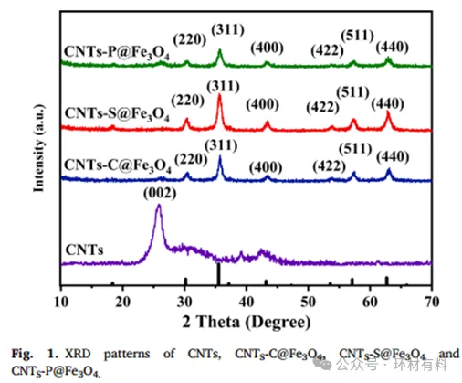 XRD图显示了纯CNTs和CNTs-X@Fe3O4纳米复合材料的结晶性。在25.9°处只观察到一个尖峰,对应于CNTs的XRD图中(002)的晶体表面。然而,XRD表征图在30.5、36、43.5、53.8、57.5和63.1处显示出6个衍射峰。根据标准卡片(JCPDS 88-0315)中的数据,这些峰分别对应于(220)、(311)、(400)、(422)、(511)、(440)的晶体表面,可归属于Fe3O4。衍射峰清晰,表明制备的Fe3O4纳米材料具有良好的结晶度。XRD衍射峰无明显变化,表明Fe3O4与功能化CNTs结合良好。