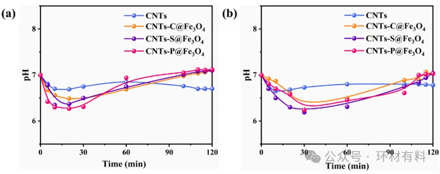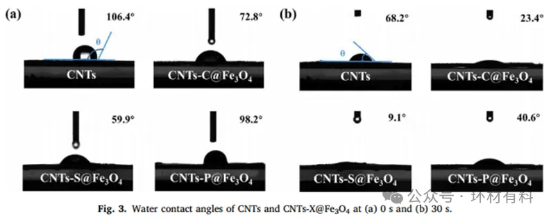 通过接触角试验研究材料的润湿性,可以从图a中看到CNTs的初始接触角大于其他材料,这说明引入官能团增加了亲水性。良好的亲水性促进了离子在溶液中的扩散和迁移,提高了离子的传输速率和吸附效率。其中CNTs-S@Fe3O4的接触角最小,亲水性最好。这可能是由于-SO3H基团的极性比其他基团更好,从而提高了润湿能力,从而有利于离子的吸附。