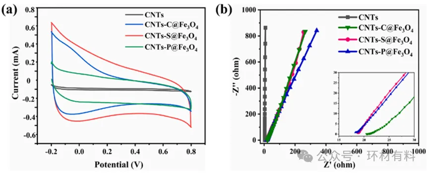 通过EIS曲线计算得到CNTs-C@Fe3O4、CNTs-S@Fe3O4和CNTs-P@Fe3O4的电荷传递电阻(Rct)分别为18.8、18.3和20.6 Ω。CNTs-S@Fe3O4的电荷转移电阻更小,线性梯度更陡,表明其具有更好的电化学性能。