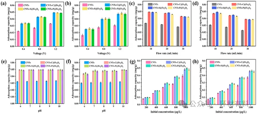 初始pH值会影响电极材料的活性位点和砷离子的形态。从图e可以看到pH对CNTs、CNTs-C@Fe3O4、CNTs-S@Fe3O4和CNTs-P@Fe3O4电极对As (V)的吸附能力没有明显影响。