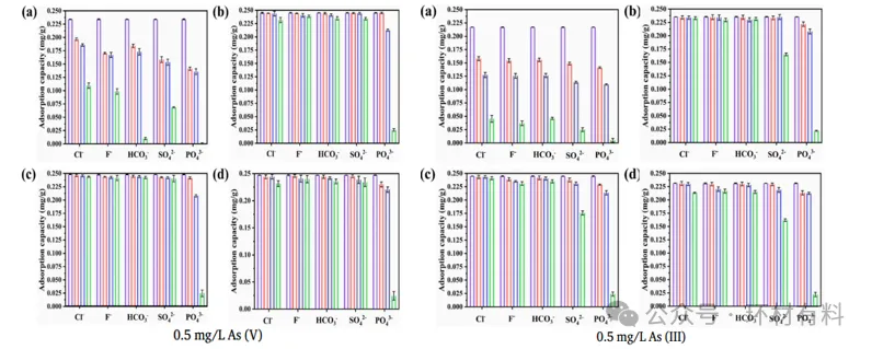 a) CNTs, (b) CNTs-C@Fe3O4, (c) CNTsS@Fe3O4和(d) CNTs-P@Fe3O4。施加电压1.2 V,流速10 mL/min, pH 7。紫色:无共存阴离子,红色:共存阴离子浓度0.5 mg/L,蓝色:共存阴离子浓度为5 mg/L,绿色:共存阴离子浓度为50 mg/L。