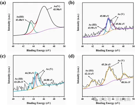 高分辨光谱中Fe-O基团的比例从62.2%下降到48.2%和53.8%。这一现象充分证明吸附是基于砷取代Fe-OH基团,吸附砷后,As (III)和As (V)出现与As-O相关的新峰。