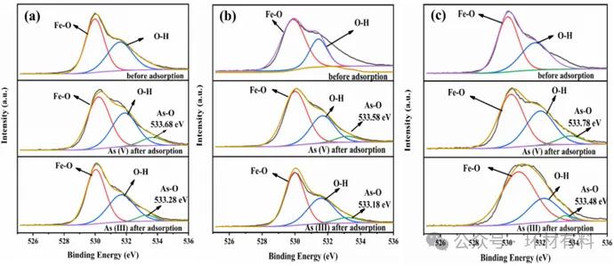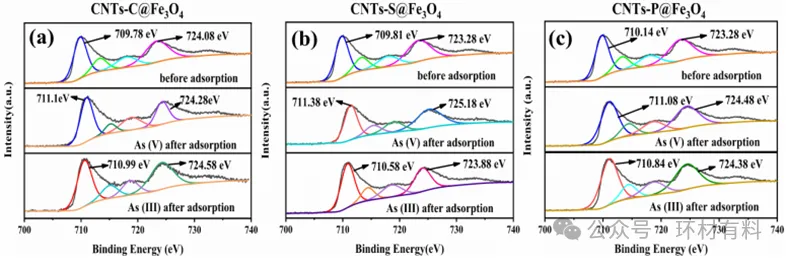 在砷被吸附之前,fe2p在710 eV和723 eV附近出现两个峰,表明铁氧化物的形成。吸附完成后,两个峰的结合能略有移位,表明Fe3O4与砷之间可能形成Fe-O-As配合物。