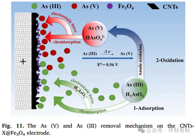 简而言之,CNTs电极对砷的吸附机制为静电吸引,而CNTs-X@Fe3O4电极对砷的吸附涉及静电吸引和化学配位机制。