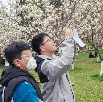 有同学走进田间,体验采摘草莓的田间乐趣,捧着鲜红的草莓露出满足又灿烂的笑容;还有同学置身金黄的油菜花田、粉白的樱花树下,与繁花相拥,笑脸比春花还要明媚。