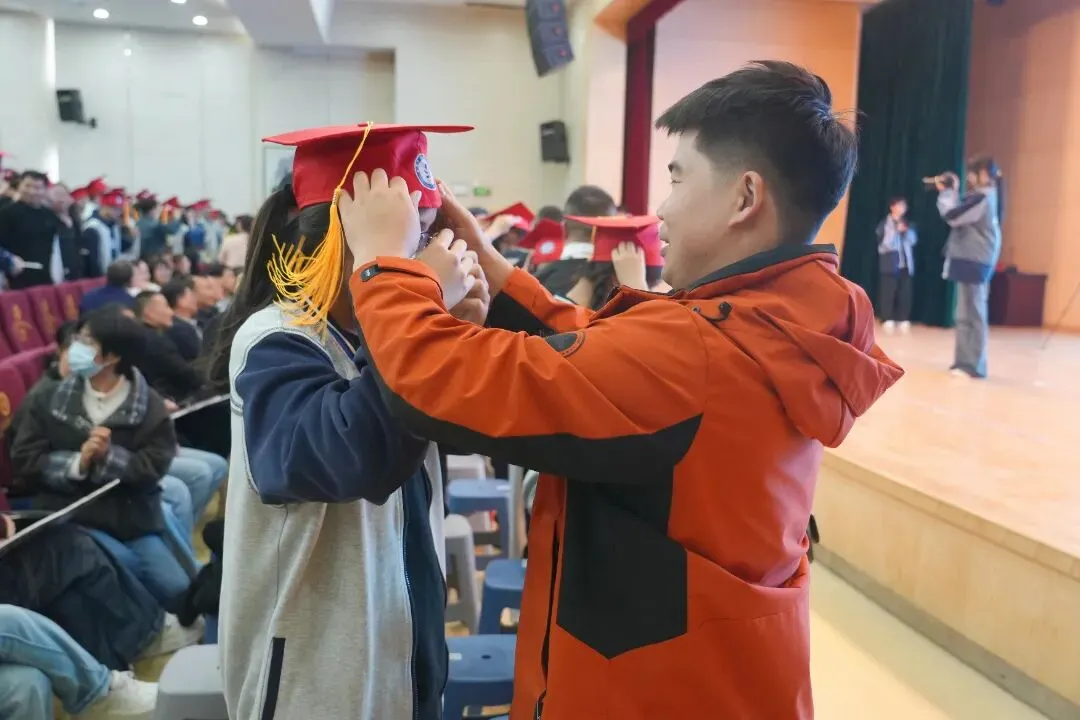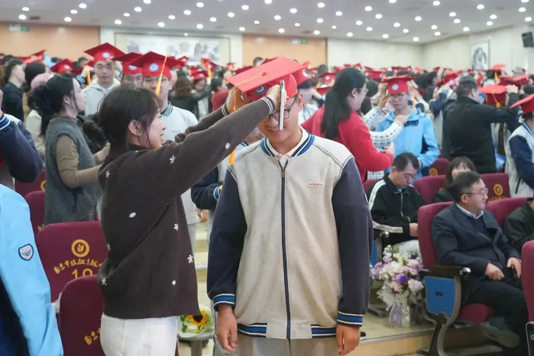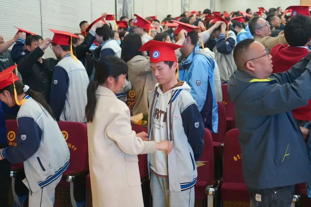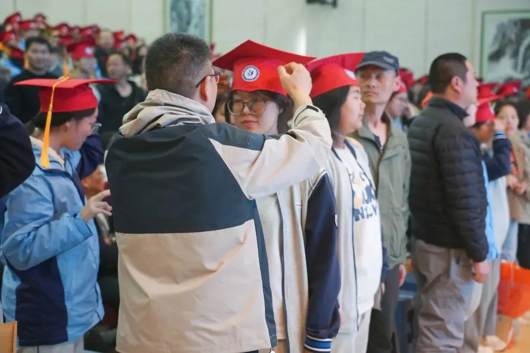 “冠者,礼之始也。”家长们为同学们整理衣摆、扶正礼帽,指尖的温度传递着十八年来的牵挂与期许,学子们也在这份温情呵护中,明白了“先正衣冠,后明事理”的深刻内涵。同学们与父母紧紧相拥,温情在这一刻被定格。