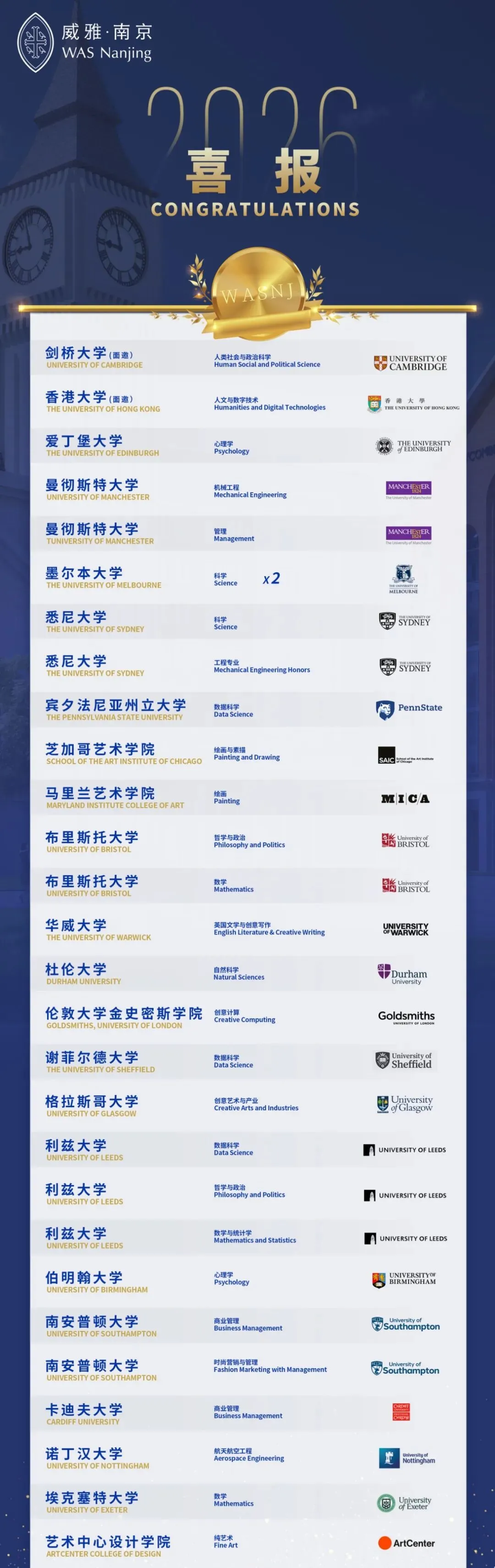 截至目前,南威学子已斩获来自英国、美国、澳大利亚、中国香港等多个国家和地区知名高校的录取通知书:英国方向学子全员斩获罗素集团院校(英国Top24顶尖高校联盟)录取,覆盖布里斯托、曼彻斯特、爱丁堡等名校;澳洲方向锁定本土排名前三的墨尔本大学、悉尼大学重磅offer;香港方向拿下地区排名第一的香港大学面邀,竞争力凸显;美国方向更是斩获全美排名第二的艺术院校——芝加哥艺术学院录取及高额奖学金。如此亮眼的成果背后,是南京威雅「全人教育」理念的生动实践。