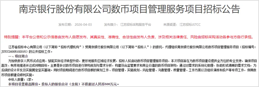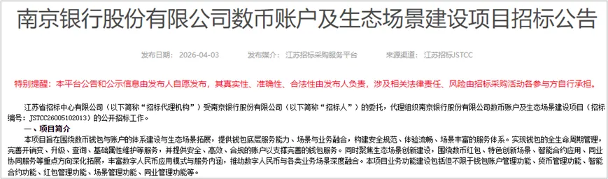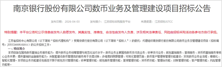 移动支付网消息:4月3日,南京银行股份有限公司(以下简称“南京银行”)在江苏招标采购服务平台发布了三则招标公告,分别是“数币项目管理服务项目”“数币账户及生态场景建设项目”以及“数币业务及管理建设项目”。