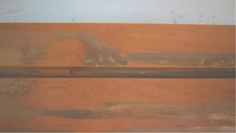 木构件表面出现发霉状暗斑、水渍状痕迹,敲击有空洞声,或木地板出现塌陷、颜色异常。