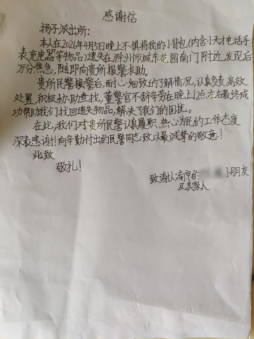 孩子特意手写感谢信拍照发给董警官