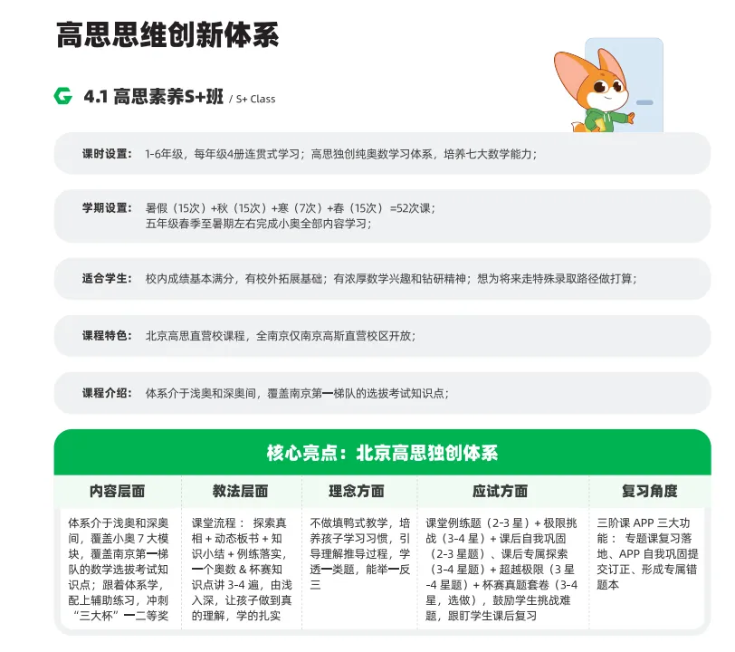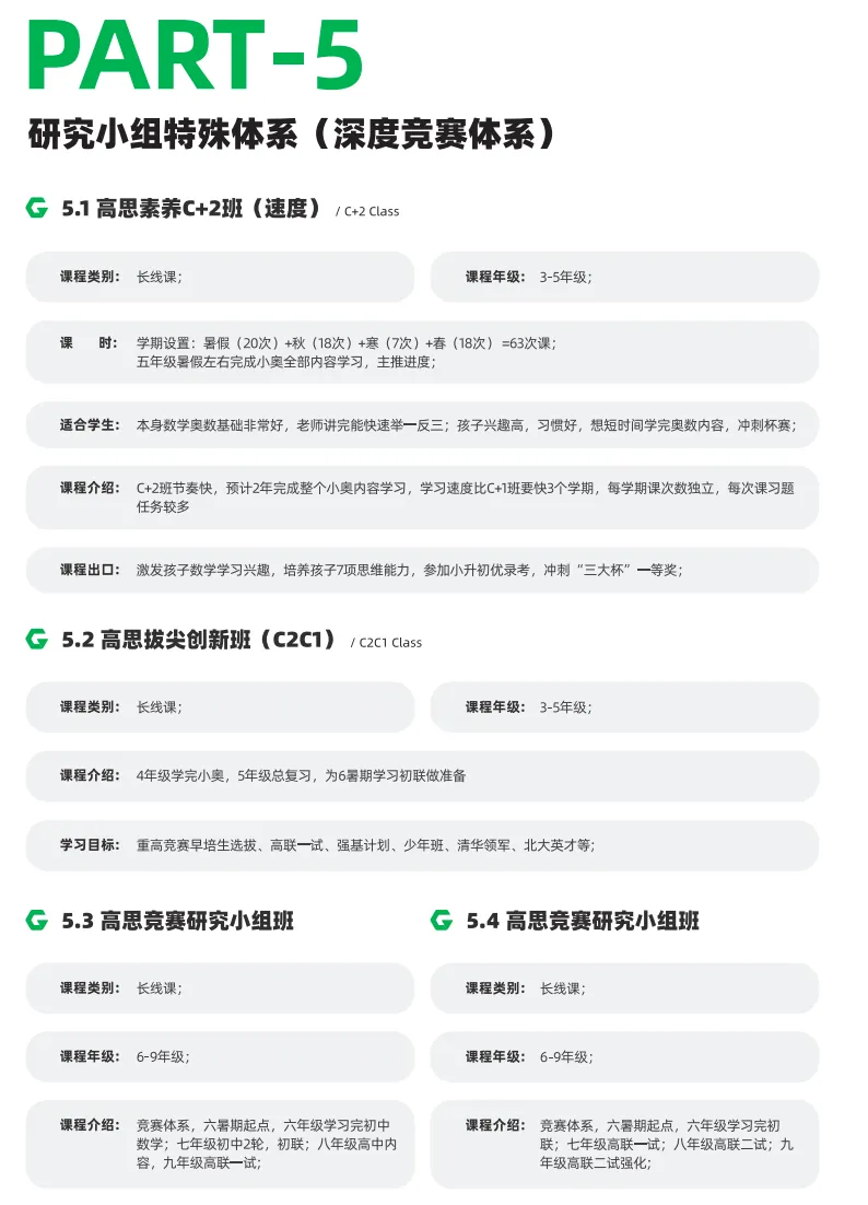 G+体系:小学校内易错点30%+附加题拔高30%+分班考浅奥和初中衔接40%,超前半年学初中;