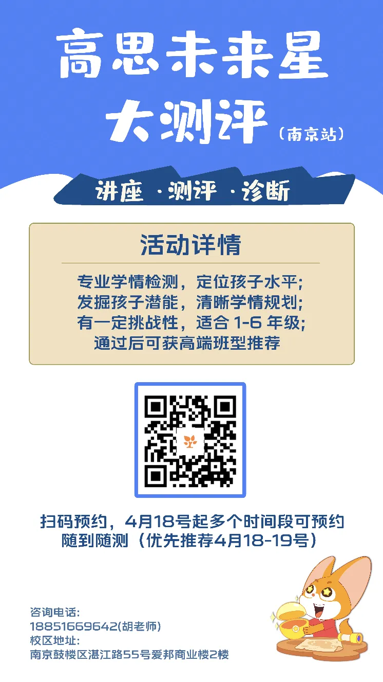 最后,4.18号“高思未来星”大测评即将开启,欢迎新老家长带小朋友来闯闯关,通过后可以参加暑假前免费公开课哦~