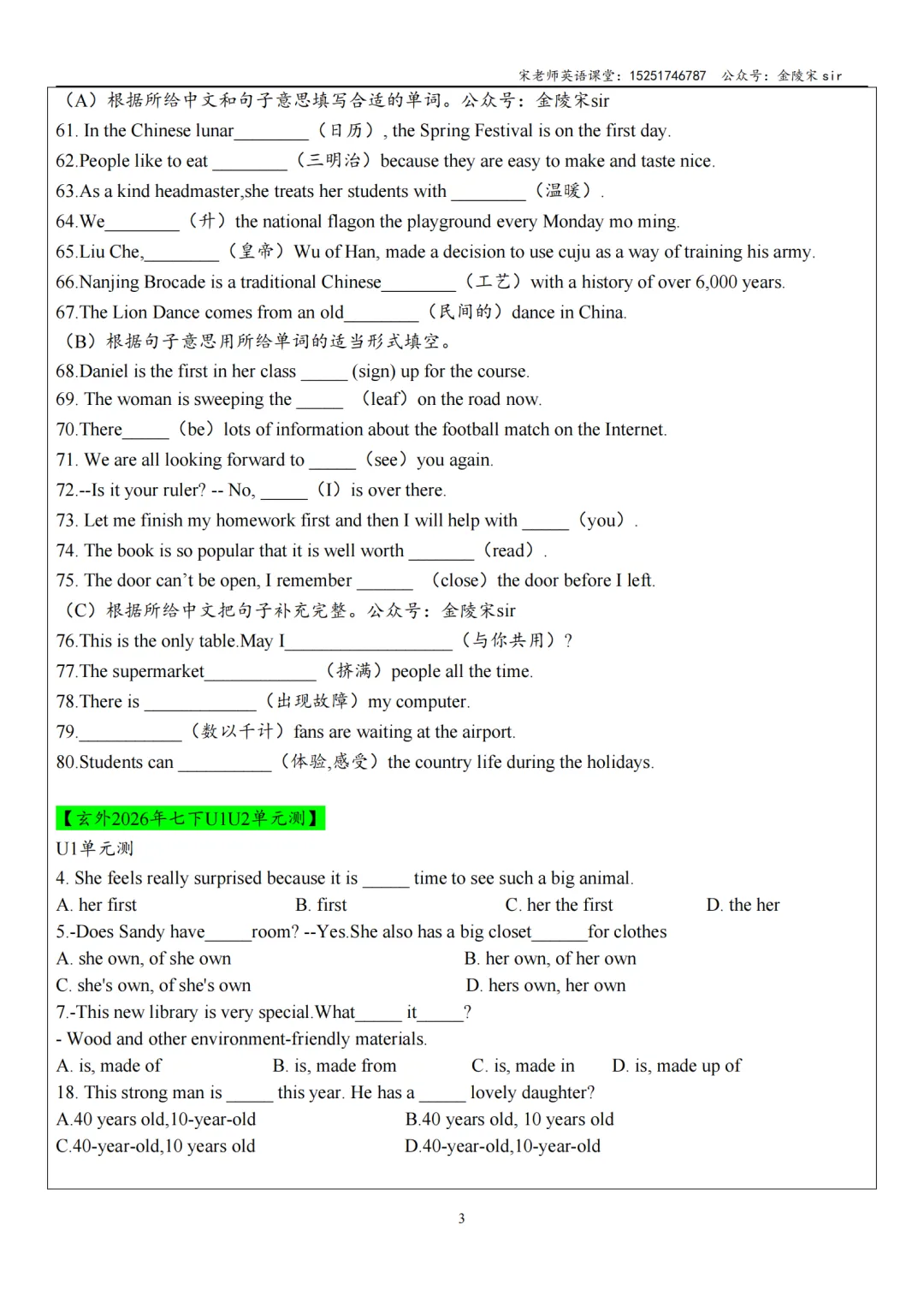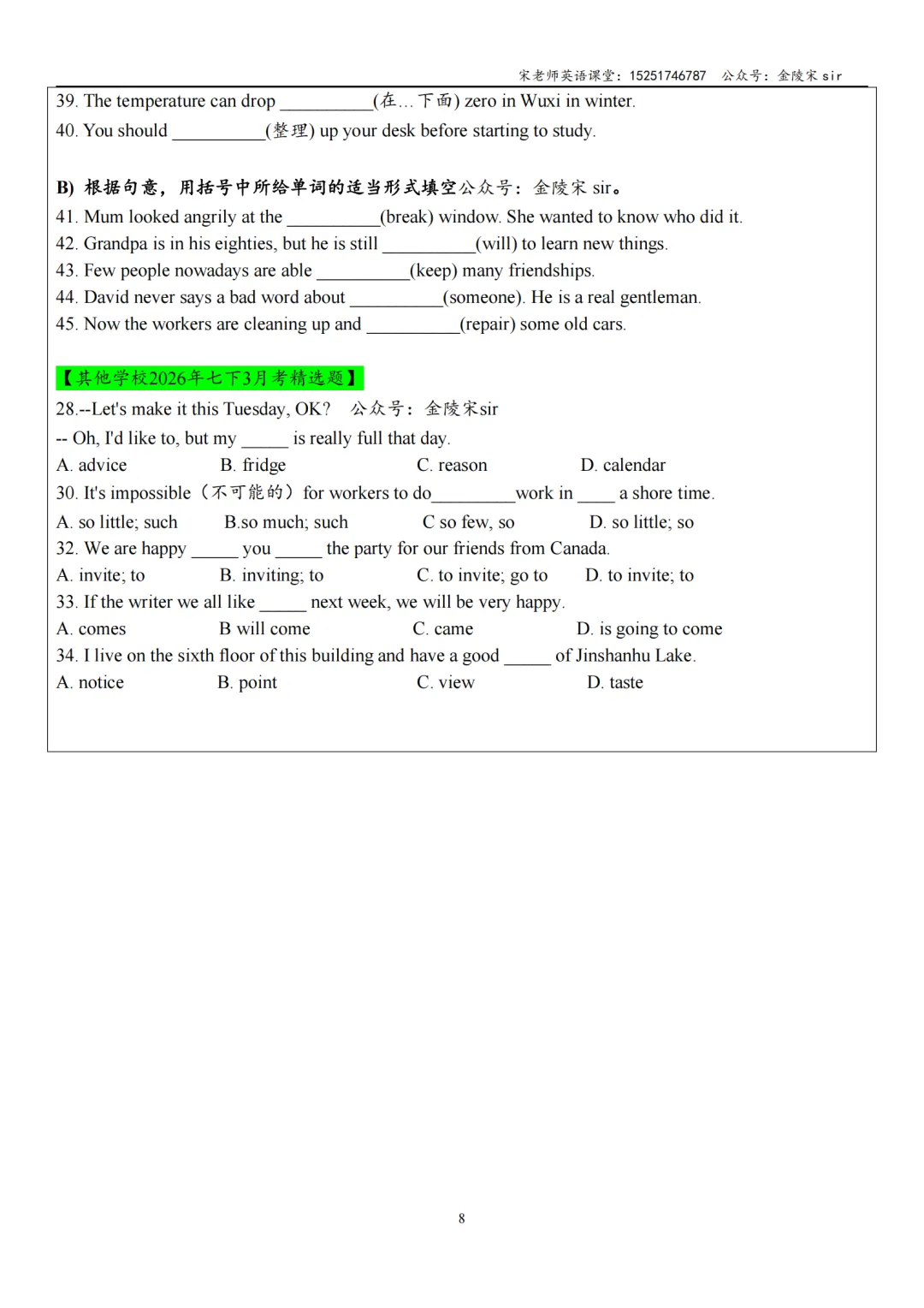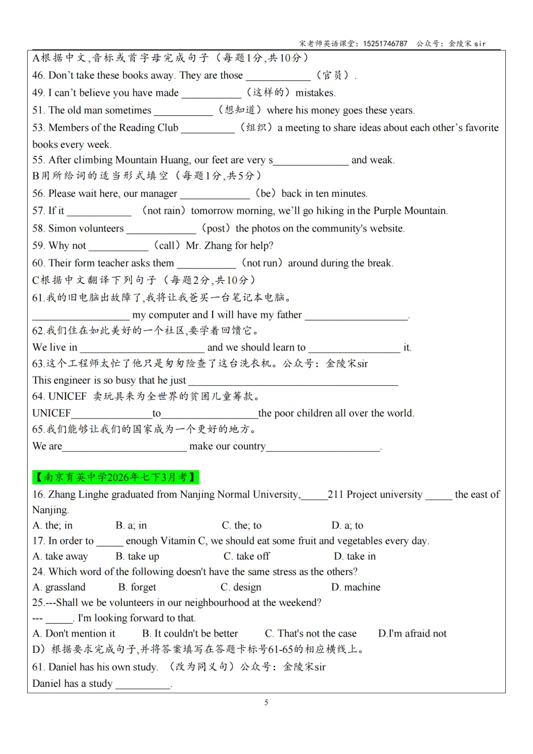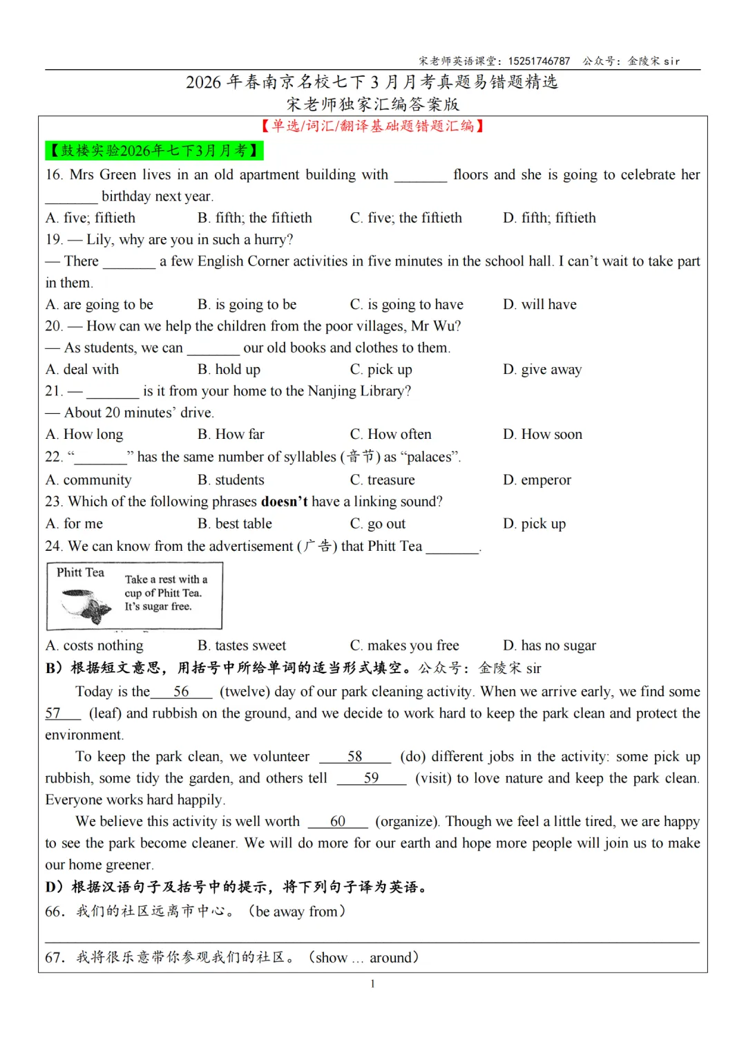 内容:南京各区名校七下3月月考真题单选/词汇/翻译精选易错题;