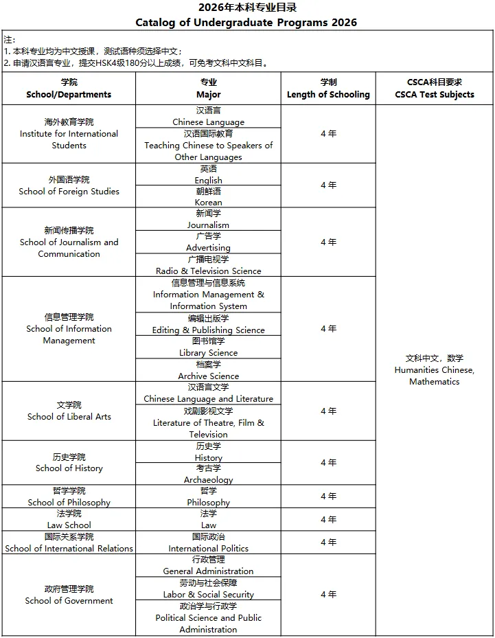 3.从2026/2027学年起,所有申请本科专业的国际学生须参加来华留学本科入学学业水平测试(CSCA测试),并提交成绩单;