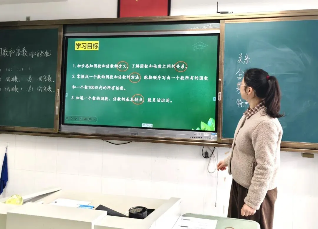 沈星池老师执教的《因数和倍数》,立足五年级学生认知特点,紧扣“主动课堂”内核,将“目标先行”作为教学关键环节,以“目标引领、学生主体、深度学习”为主线,把抽象数学概念转化为可探究的课堂活动。课堂伊始,教师以课题激趣,引导学生自主提出探究问题,随后带领学生梳理学习目标、圈画核心关键词,通过清晰的目标设定唤醒学生主动学习意识,让课堂探究更具针对性,也让“目标先行”在教学中得到有效尝试。