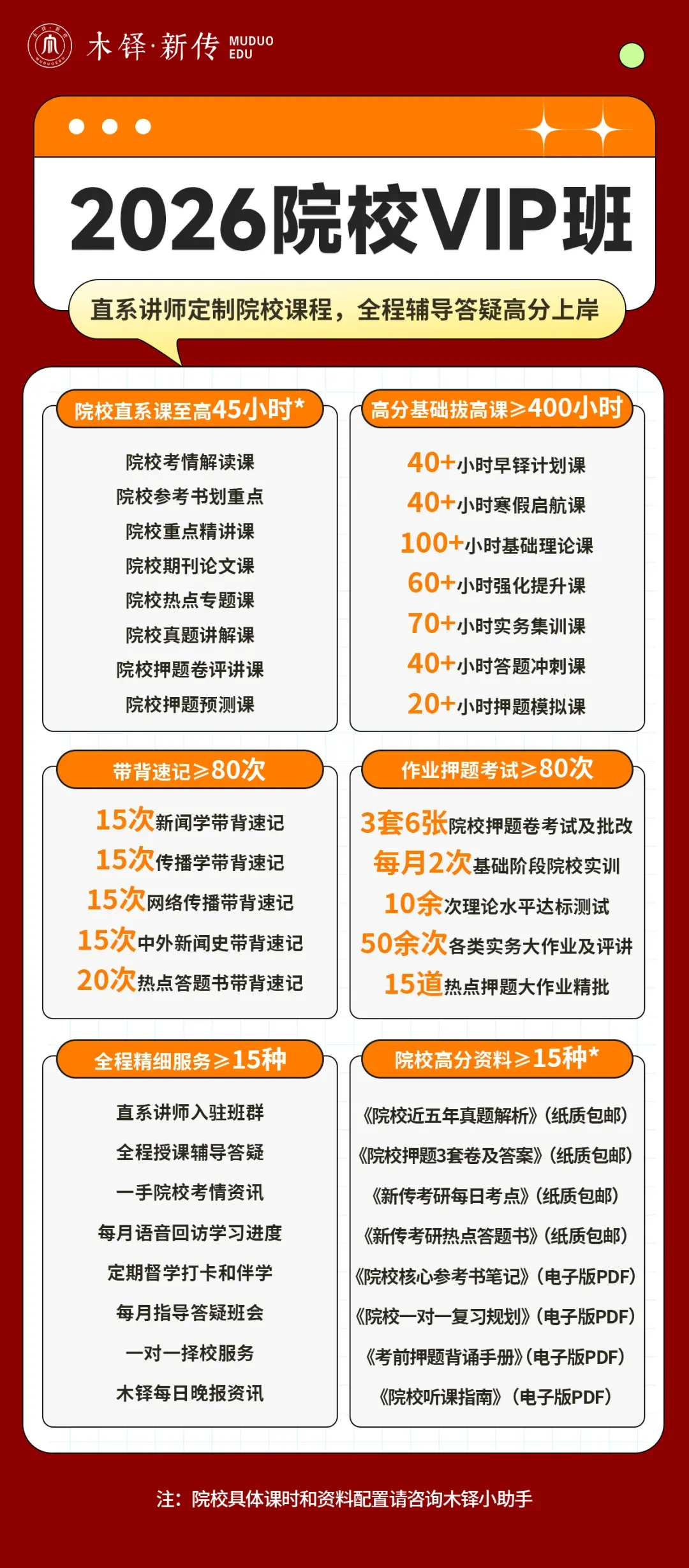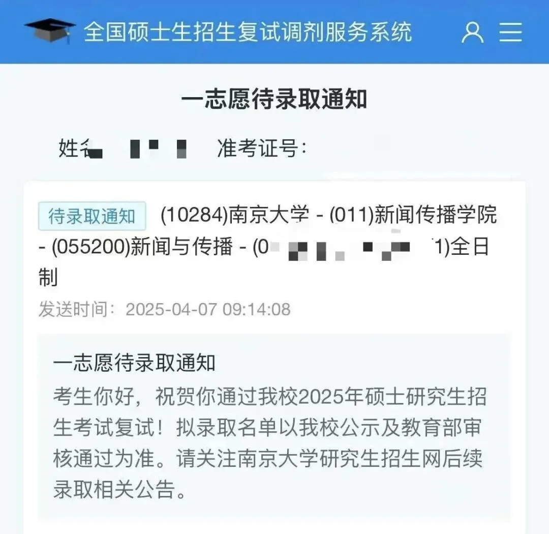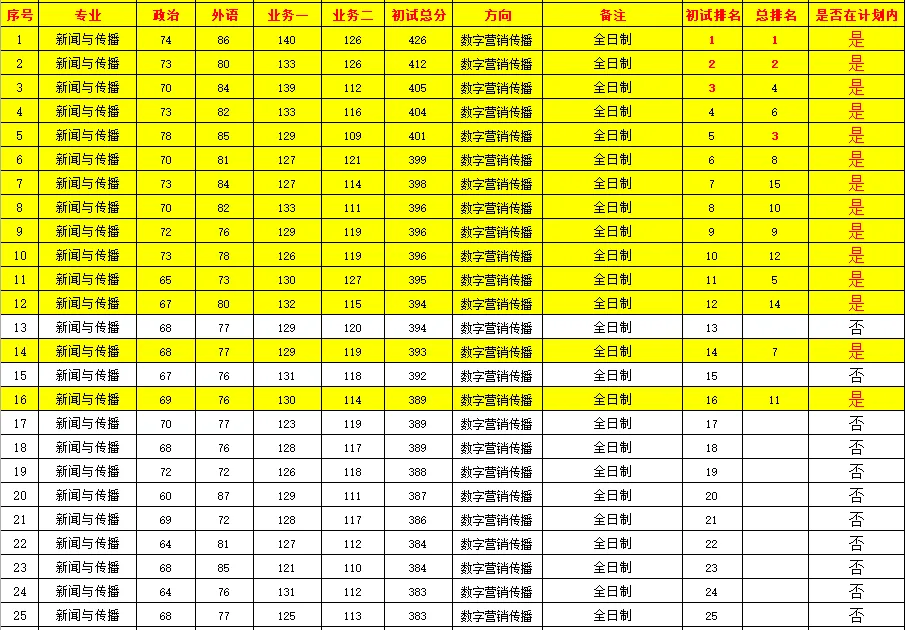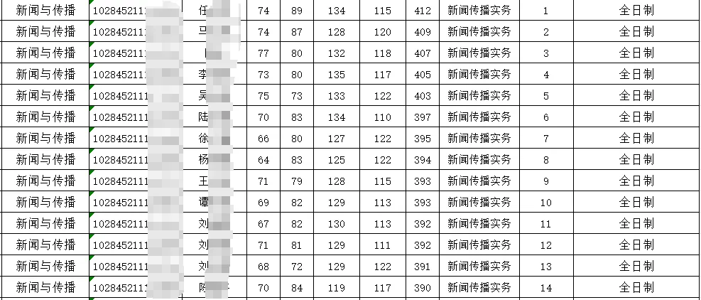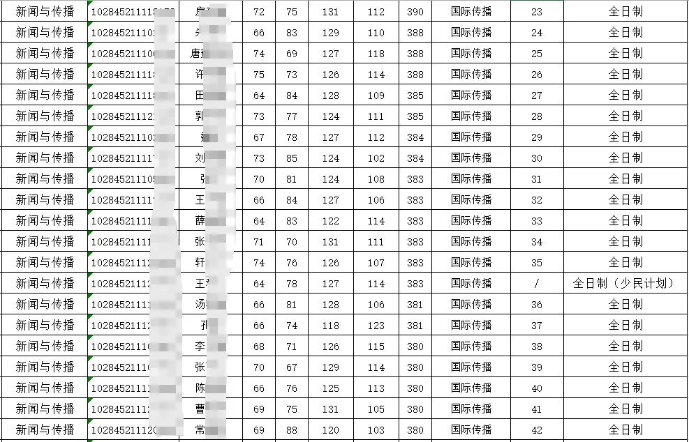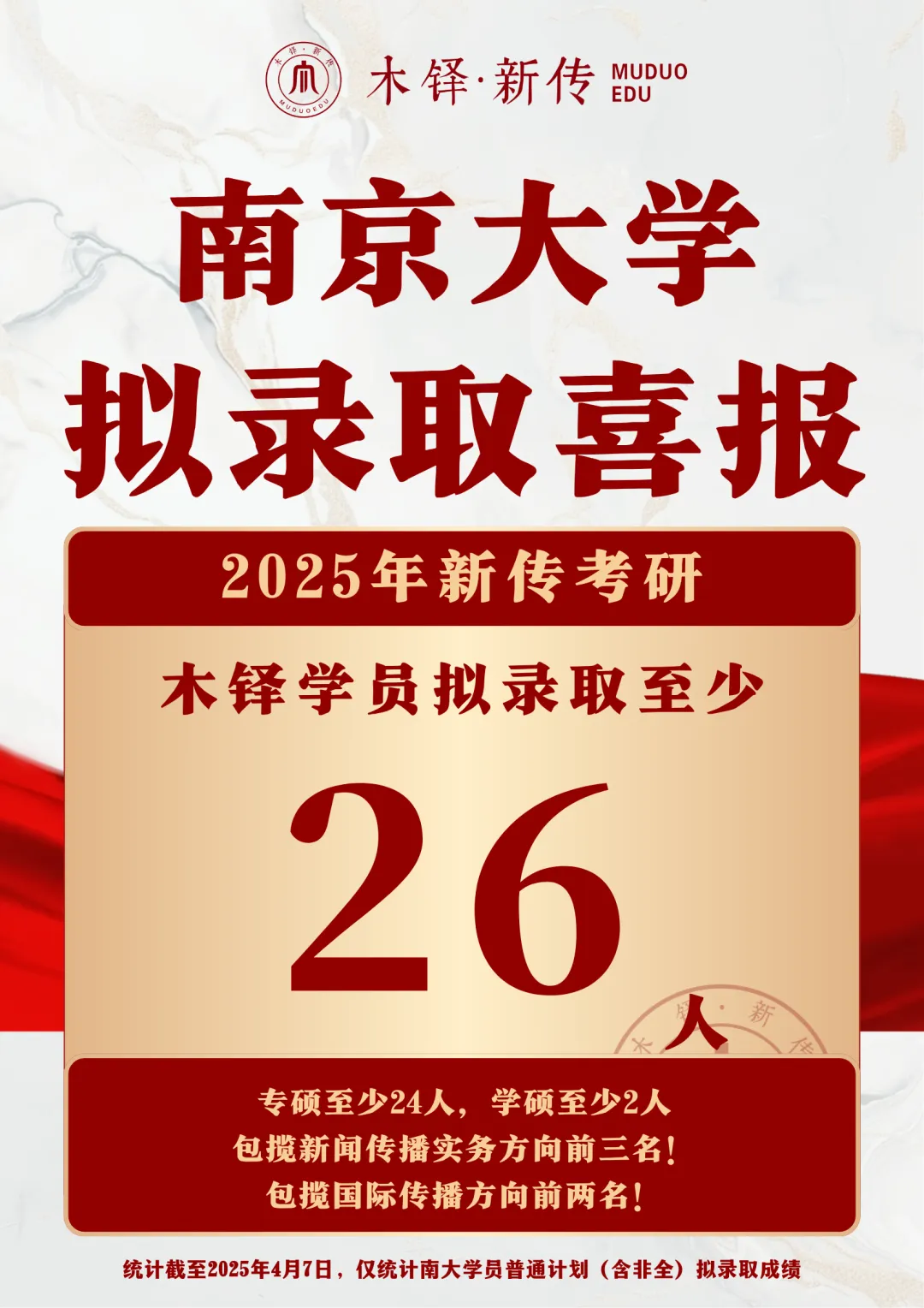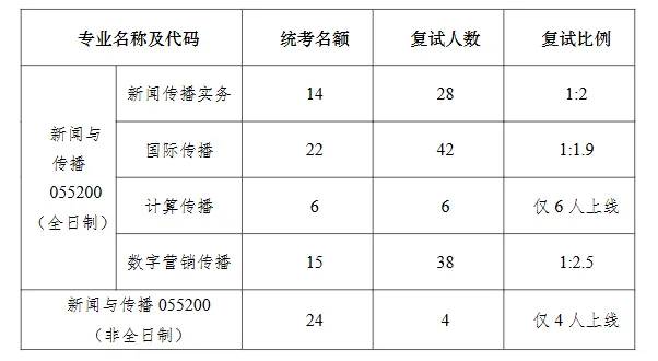 4月2日,南京大学新闻传播学院发布2025年硕士研究生招生考试复试成绩及总成绩。4月7日起,南京大学新闻传播学院通过“研招网微信号”陆续发布拟录取通知。按照惯例,根据此前发布的计划录取名额可知:01:2025年复试结果分析学硕等额复试,专硕计算传播方向连续两年“0淘汰”2025年学硕方向计划统招9人,新闻学3人(仅3人过线),传播学6人(仅6人过线),进入复试的考生均在计划录取名额内。2025年专硕方向计划统考招生共81人(不含特殊计划),全日制名额57人,非全日制24人(仅4人上线)。专硕计算传播方向连续两年“0淘汰”!当然,南大复试公平公正,也出现了低分复试逆袭的情况。新闻传播实务方向计划统考录取14人,复试进面28人,复试比例1:2。计划录取名额内最高分412分(木铎学员),最低分381分(初试排名26,逆袭至第9),计划外最高分393分。初试前八名全部在计划名额内(初试拿高分才是上岸最强法则)。国际传播方向计划统考录取22人,复试进面42人,复试比例1:1.9。计划录取名额内最高分413分(木铎南大小班学员),最低分388分,计划外最高分393分。初试前18名全部都在招生计划内。计算传播方向计划统考录取6人,复试进面6人,仅6人上过线,都在计划录取名额内,完全0淘汰,堪称“进面即上岸”。最高分为396分,最低分383分。同样的情况,2024年该方向计划招录6人,仅有5人上线。这也是南大专硕中竞争热度最低的方向。数字营销传播方向计划统考录取15人,复试进面38人,复试比1:2.5。计划录取名额内最高分416分,最低分381分(初试第30名逆袭第13名)。初试前12名均在计划内。计划外最高分394分。非全日制专硕方向计划录取24人,和全日制专硕统一划线后仅有4人过线。按照往年情况,非全日制“进面即上岸”,也是0淘汰。02:2025年专硕初试成绩分析全日制专硕总分平均分为390.25,英语平均分78.5经过对专硕各方向一志愿考生的成绩计算(不含非全日制和特殊计划考生成绩),可以得知:专硕总分平均分为390.25,两门专业课平均分为121.25。政治平均分为68.5,英语平均分为78.5。新闻传播实务方向:总分平均分为391,两门专业课平均分为121.5国际传播方向:总分平均分为392,两门专业课平均分为121计算传播方向:总分平均分为388,两门专业课平均分为121数字营销传播方向:总分平均分为390,两门专业课平均分为121.5新闻传播实务方向:复试进面共28人,计划录取14人。2024年计划招生11人,预计扩招3人。本方向最高分412分(第一名为木铎学员),最低380分(共有两位),总分平均为391分。超过400分的有5位,380分至390分分数段有23人,预计该分数段复试竞争最为激烈。专业课一平均分为128,专业课二平均分为115分,两门专业课平均分为121.5。公共课成绩普标较高,政治平均分69分,英语平均分78分。国际传播方向:复试进面42人(不含1位少数民族骨干计划),计划录取22人。2024年计划招生26人,预计扩招4人。本方向最高分413分(第一名为木铎学员),最低分380分(共有5位),总分平均分为392。400分及以上有9人,380分至388分分数段有20人,预计该分数段复试竞争最为激烈。专业课一平均分为128,专业课二平均分为114,两门专业课平均分为121分。政治平均分69分,英语平均分高达80分!这也证明了想要考自划线院校,特别是顶尖新传院校,任何一门科目都能拖后腿。
