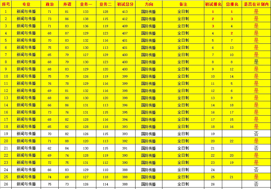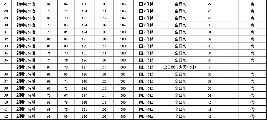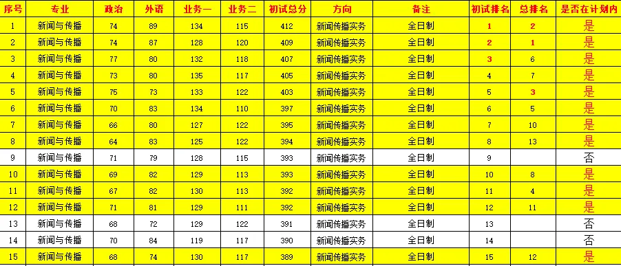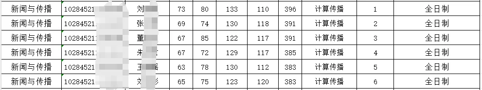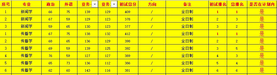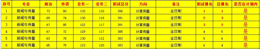 传播学仅6人上线,计划录取6人。复试线365分,最后一名考生分数为381分,最高分142分,平均分为393。专业课一平均分高达137,专业课二平均分为124,两门专业课平均分高达130.5。