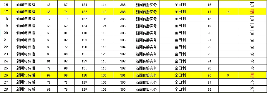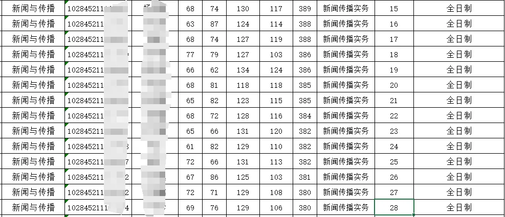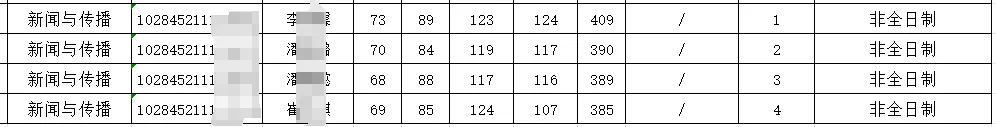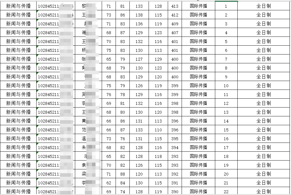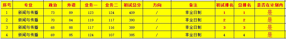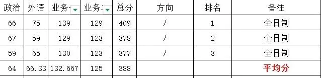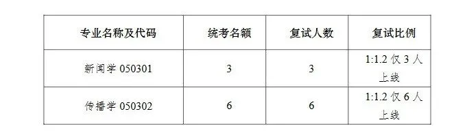 新闻学仅3上线,计划录取3人。复试线365分,最后一名考生分数为377分。最高409分,平均分388。专业课一平均分约为132.667,专业课二平均分为125。两门专业课平均分为128.83。