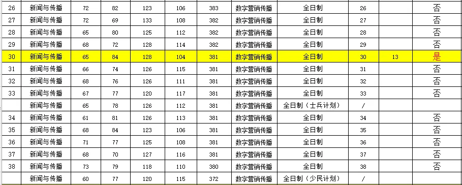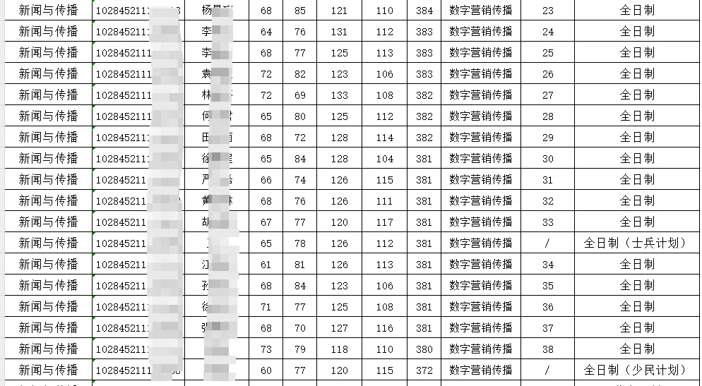 计算传播方向:复试进面6人(仅上线6人),计划录取6人。2024年计划录取6人,仅5人上线。该方向是南大专硕竞争相对较小的方向,非常欢迎跨考生报考。该方向总分平均分和公共课平均分略低于其他方向。最高396分,最低383分。总分平均分为388。专业课一平均分为126,专业课二平均分为116,两门专业课平均分为121。政治平均分为67,英语平均分为77。数字营销传播方向:复试进面38人(不含1位士兵计划和1位少数民族骨干计划),计划录取15人。2024年计划录取19人,名额减少4人。该方向最高分426分,同时为专硕最高分,最低为380分,总分平均分为390。400分以上有5位,390分以上有15位。预计390分以下分数段复试竞争非常激烈。专业课一平均分为128,专业课二平均分为115,两门专业课平均分为121.5。政治平均分为69,英语平均分为79。非全日制专硕方面:计划录取24人,仅有4人上线。2024年计划录取26人,仅有10人上线。非全日制方向和全日制专硕统一划线,上线几乎等于上岸!新传学院也一贯不接受任何形式的调剂申请。非全日制最高分也达到了409,总分平均分为393,专业课一平均分为120.8,专业课二平均分为116,两门平均分为118.4。