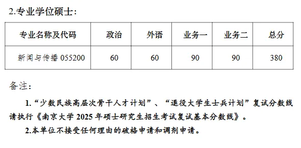 专硕方向,复试线为总分380分,政治和外语60分,专业课一和专业课二90分。与2024年专硕复试线相比,复试线逆势上涨10分!新闻传播实务方向计划统考录取14人,复试进面28人,复试比例1:2;国际传播方向计划统考录取22人,复试进面42人,复试比例1:1.9;计算传播方向计划统考录取6人,复试进面6人(仅6人上线)。数字营销传播方向计划统考录取15人,复试进面38人,复试比1:2.5。2025年数字营销传播方向复试比最高,2024年为新闻传播实务方向。复试比最低为计算传播方向,南京大学专硕各方向初试考试内容一致,复试分数线统一划线。但是到了复试阶段,分方向复试和排名录取。请2026年备考南大新传的考生一定要合理选择报考方向,避免扎堆报考某一方向。04:2025年学硕复试线分析传播学暴跌45分,新闻学降低13分传播学方向,复试线总分365分,政治和外语55分,专业课一和专业课二90分。同2024年传播学复试线相比,复试线暴跌45分,传播学计划统考录取6人,仅6人上线。与2024年计划统考录取名额保持一致。新闻学方向,复试线为总分365分,政治和外语55分,专业课一和专业课二90分。与2024年新闻学复试线相比,复试线降低13分!新闻学计划统考录取3人,仅3人上线。与2024年计划统考录取名额相比,扩招1人。 05:2025年学硕初试成绩分析 专业课平均分129.67,赋分相当友好学硕方向进面考生专业课成绩较高,专业课平均分约为129.67。这也反映了南大新传阅卷赋分相当友好,考生专业学术水平过硬。
