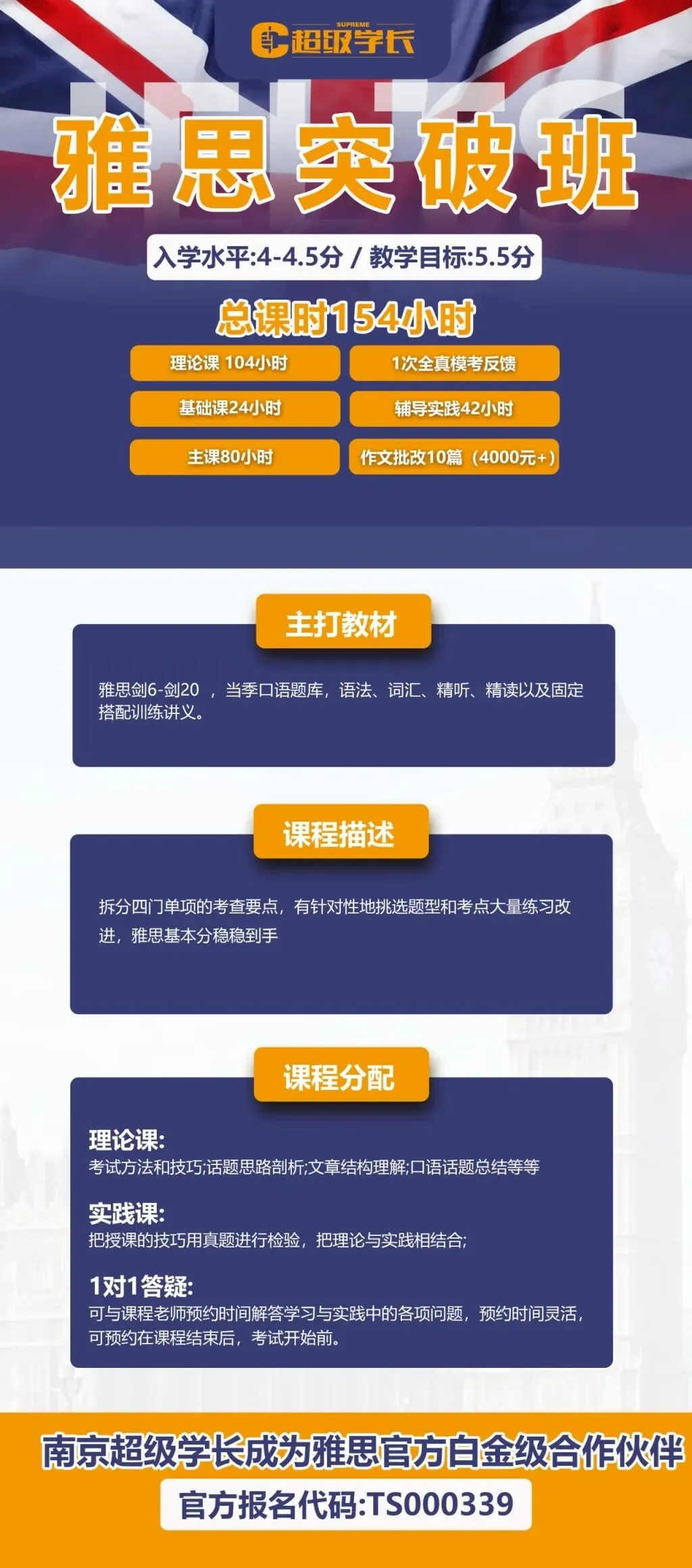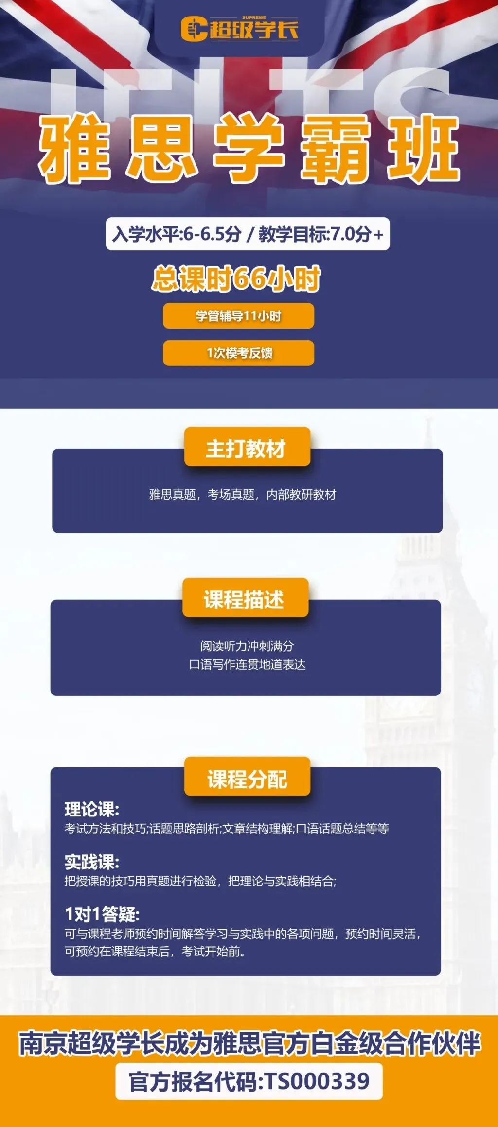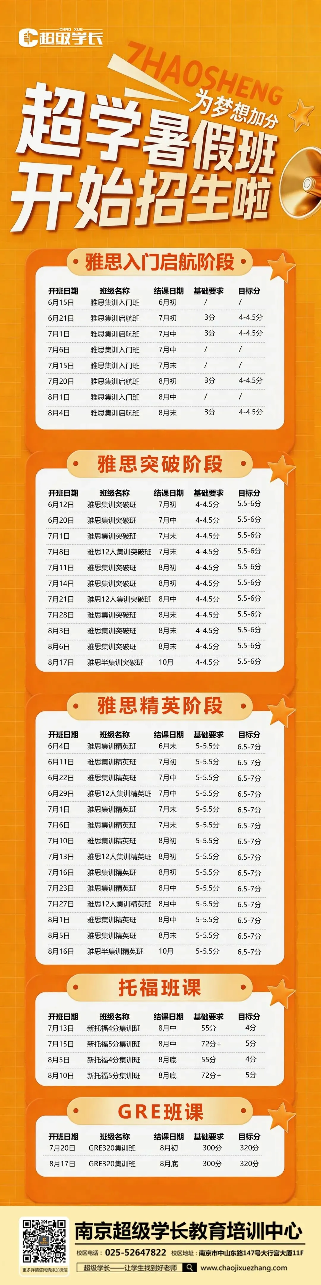 欢迎预约免费测试+免费试听+免费定制课程方案,提前感受老师的授课,给自己20天,来南京超级学长暑假班,把雅思高分这件事,真正落实。