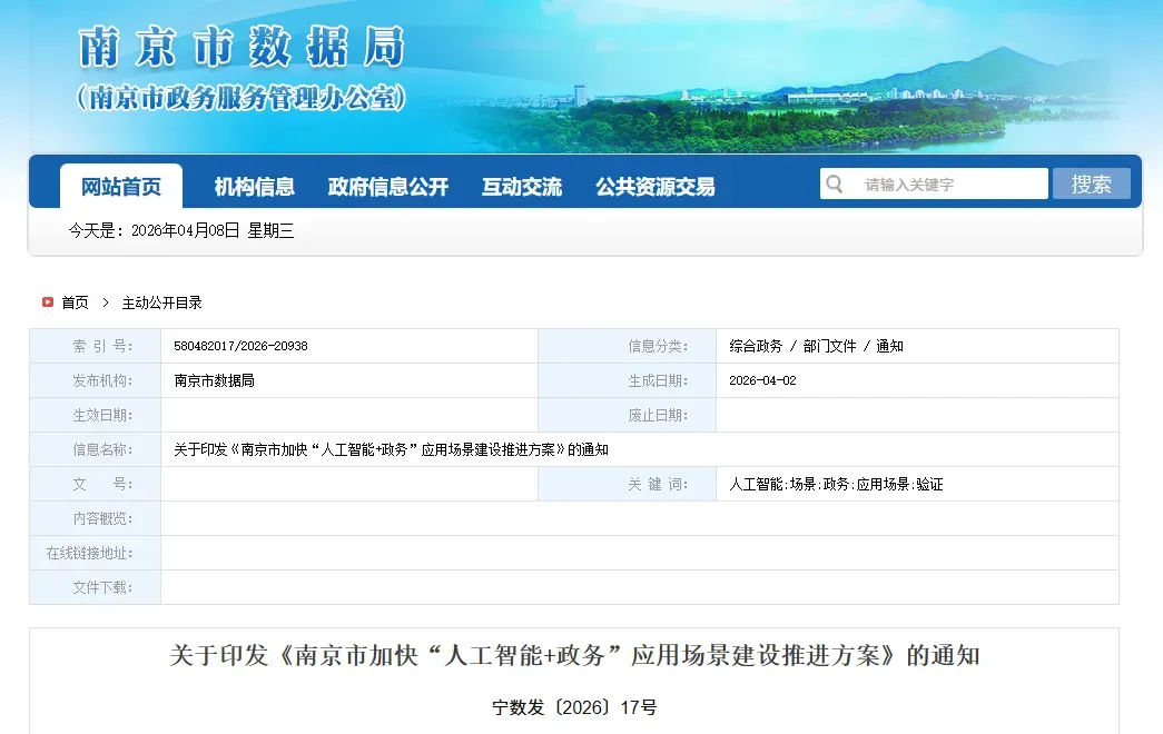 近日,南京市数据局、南京市城市数字治理中心联合印发《南京市加快“人工智能+政务”应用场景建设推进方案》。