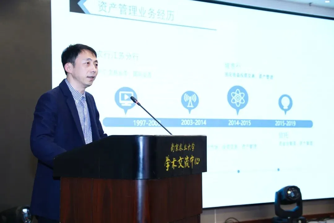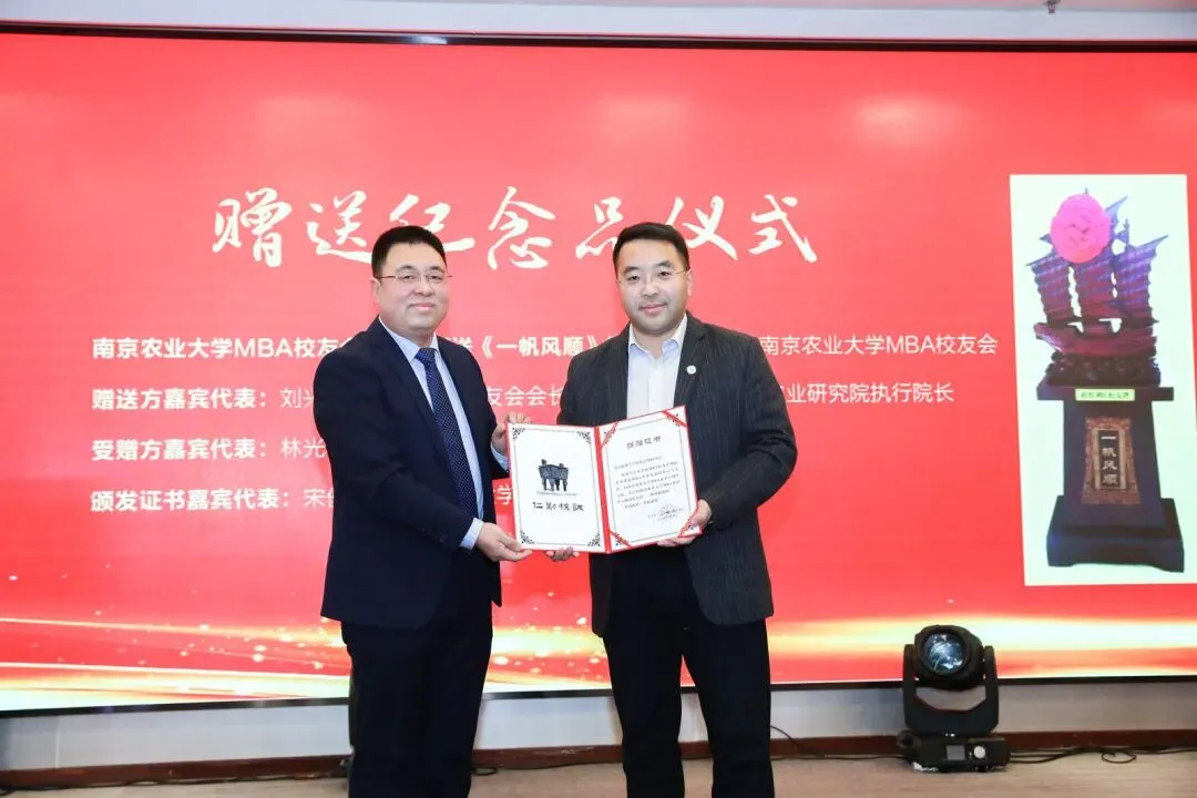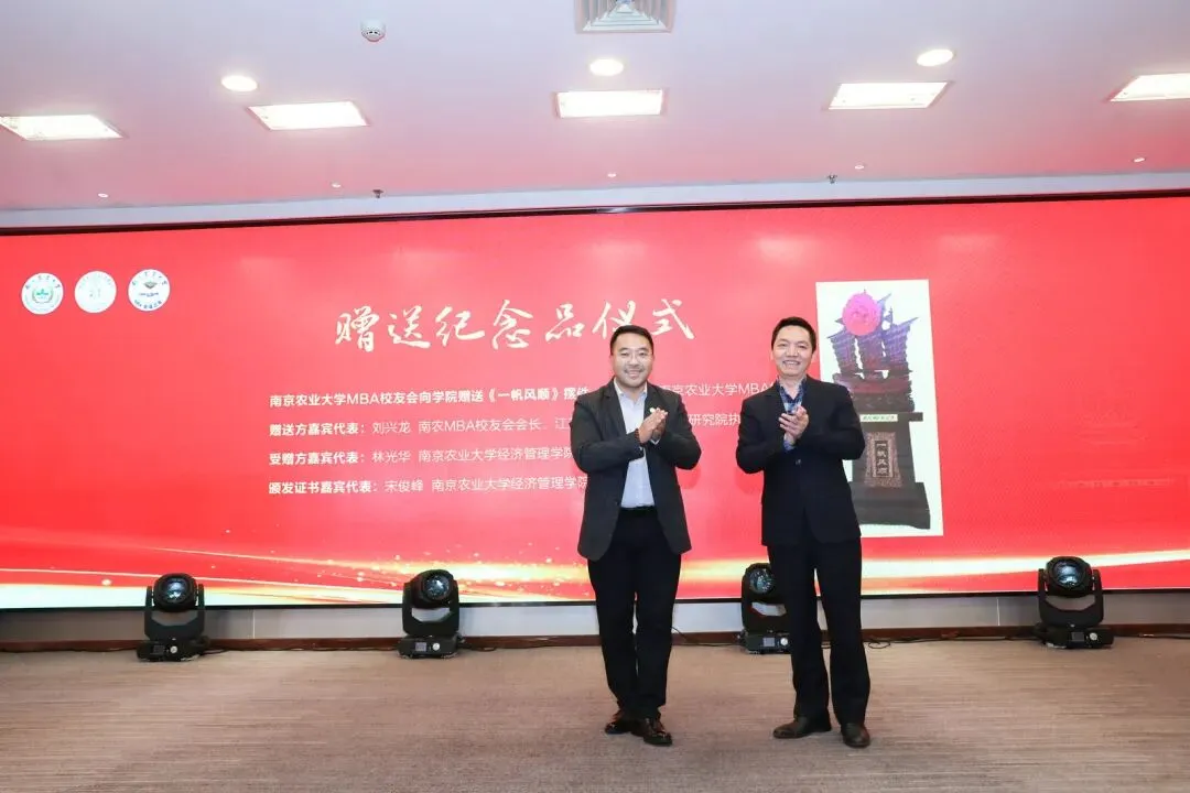 2010级校友詹敏瑟、2015级校友吴凯、2018级校友陈辉作为MBA校友代表先后发言,分别讲述自身在南农MBA学习、生活的经历与感悟,纷纷表达了对学校、老师的感恩之情,同时祝愿母校MBA能够在下一个十年书写更多精彩篇章。 值南农MBA办学十周年之际,江苏省MBA企业家联谊会向学院赠送“诚朴勤仁”卷轴,南农MBA校友会向学院赠送“一帆风顺”摆件,赠送方代表胡亚军秘书长、刘兴龙会长,林光华副院长代表学院上台接受赠礼,宋俊峰副书记代表学院颁发赠送证书。 会上举行了MBA新任校外导师聘任仪式,江苏省人民政府研究室经济研究中心副主任吴江,人行南京分行货币信贷统计处副处长林琳,明特量化董事长赵亮,杭州银行南京分行营业部副总经理戴润静,南京证券投资银行无锡业务部负责人程桂军,山西证券上海固收部执行总经理付英军,深圳汇融数字科技有限公司首席执行官曾再兴,中华财险江苏分公司党委委员、副总经理顾祖平等9位高管受聘为我校MBA校外导师,姜海书记为新任校外导师颁发聘书。 在新任校外导师分享环节,吴江副主任、赵亮董事长和付英军总经理作为代表进行了“强化政策导向 放大学术研究成效”“科技金融发展趋势”和“资产管理业务经历概况”的主题分享。